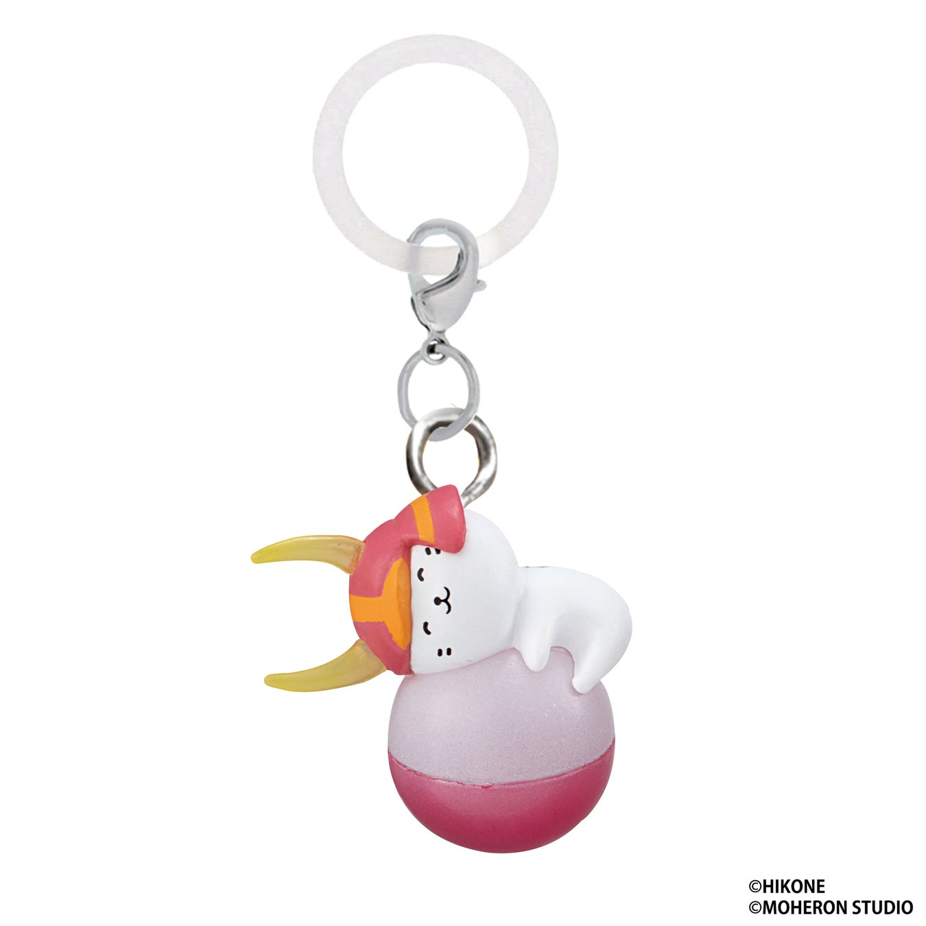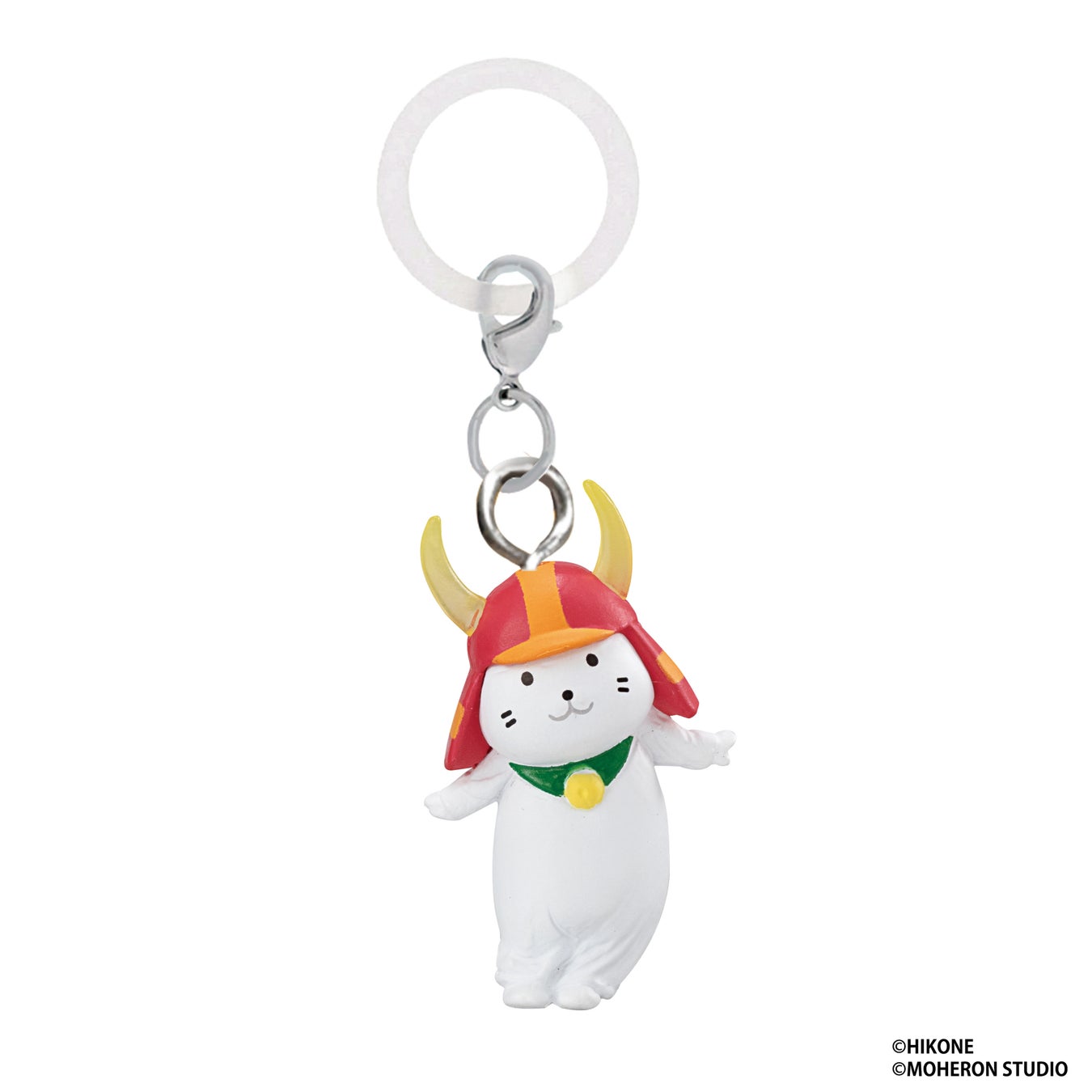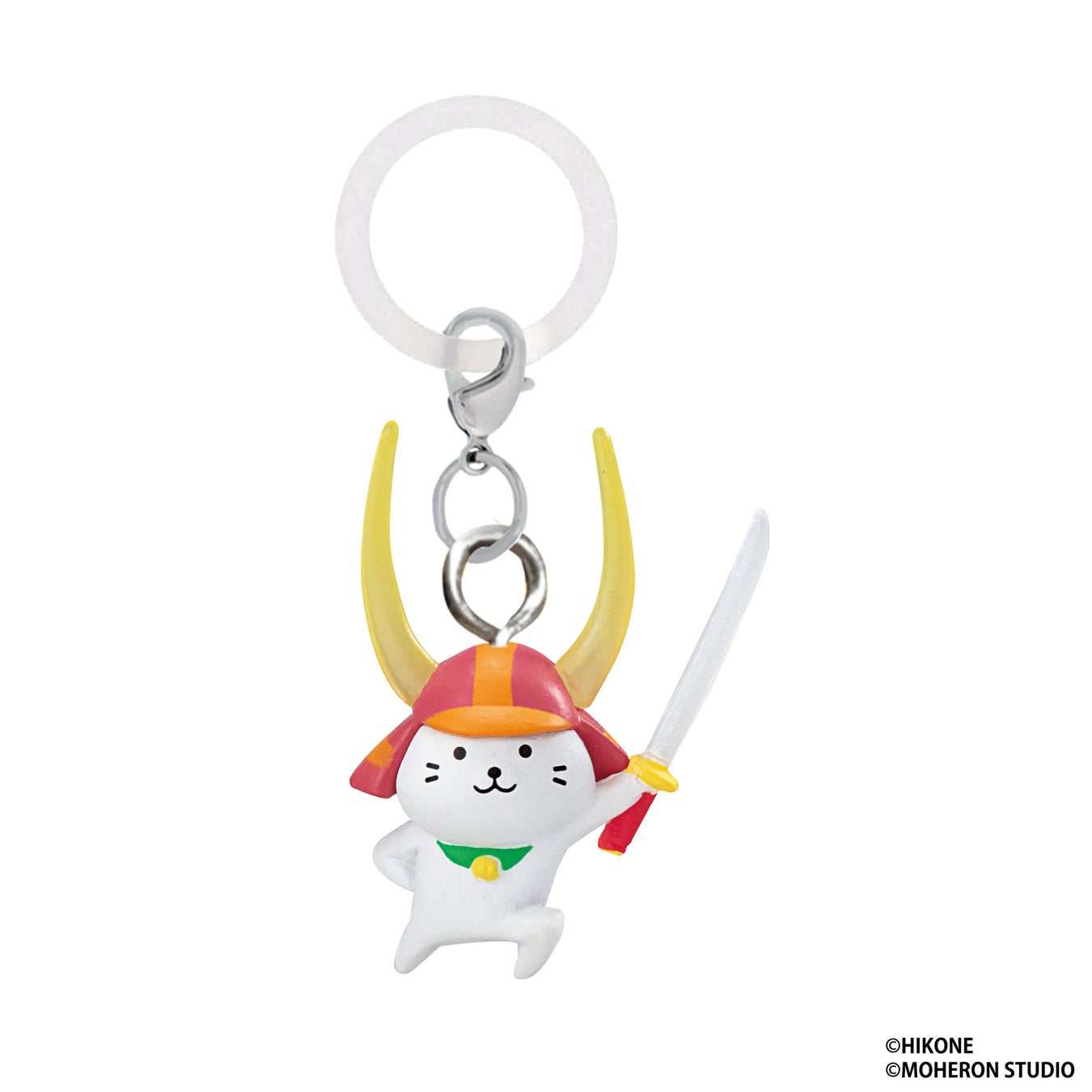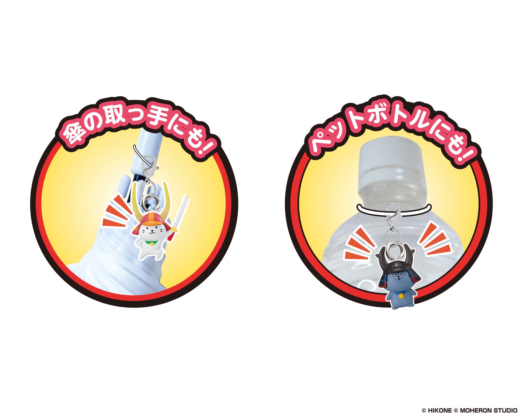 本商品は、全国で愛される滋賀県彦根市のご当地キャラクターである「ひこにゃん」と、ひこにゃんの公認ライバル「わるにゃんこ将軍」をデザインした、カニカン&シリコンパーツ付きの全高約30~40㎜のマスコットです。付属のカニカンとシリコンパーツを傘やペットボトルなどにつけることで、自分の持ち物の”めじるし”として使用することができます。
