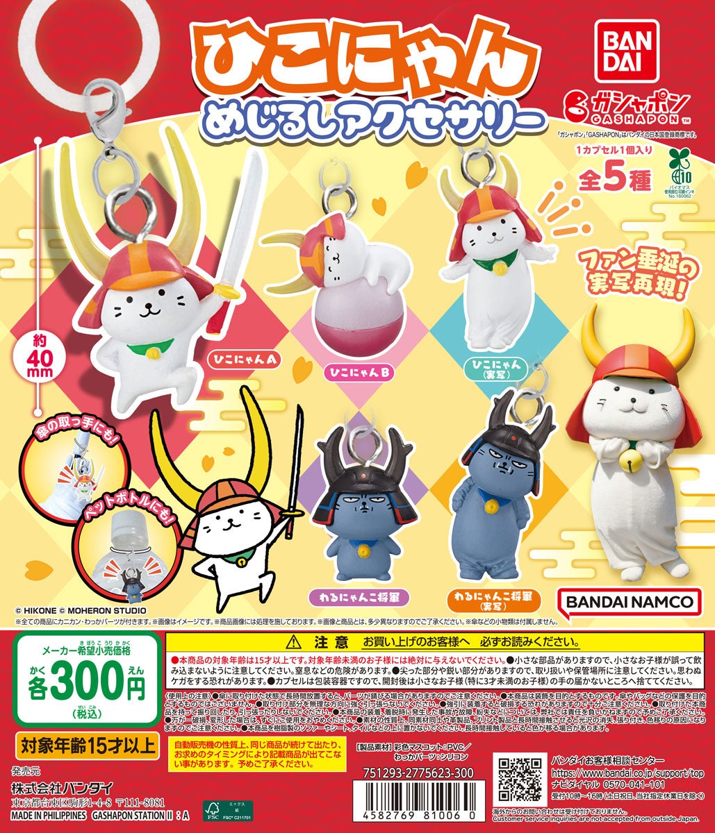 株式会社バンダイ ベンダー事業部(本社:東京都台東区)は、全国で愛される滋賀県彦根市のご当地キャラクター「ひこにゃん」の『ひこにゃん めじるしアクセサリー』(1回300円・税10%込、全5種)を2025年5月第3週より全国のガシャポンバンダイオフィシャルショップ、玩具売場、量販店、家電店などに設置されたガシャポン自販機シリーズにて発売いたします。