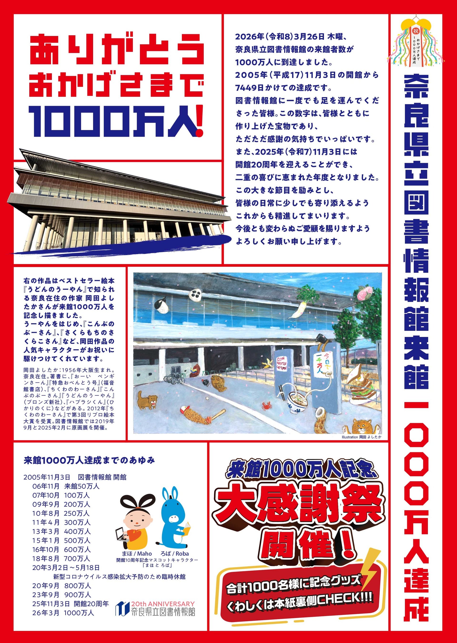 2026年3月26日、奈良県立図書情報館の来館者数が1000万人に到達しました。これを記念し、奈良在住の絵本作家岡田よしたかさんの書き下ろしイラストをプリントしたノートがもらえる「大感謝祭」を開催。