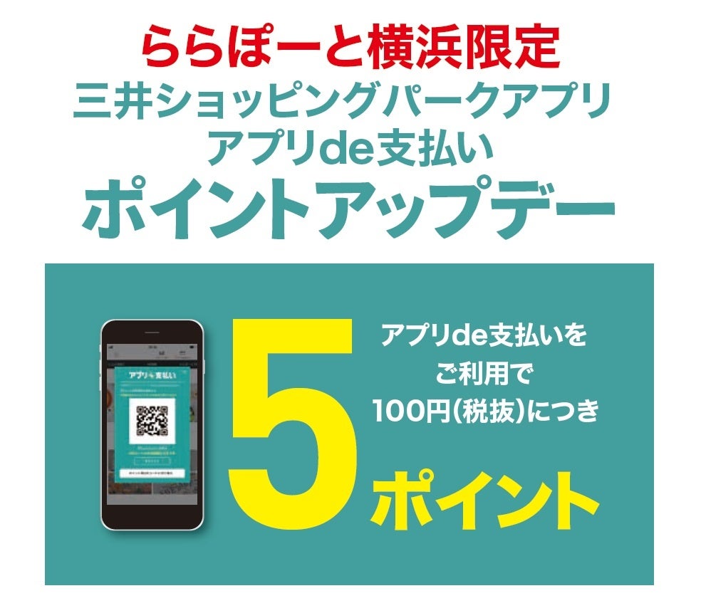 - ららぽーと横浜限定 アプリde支払いご利用で5ポイント進呈キャンペーン