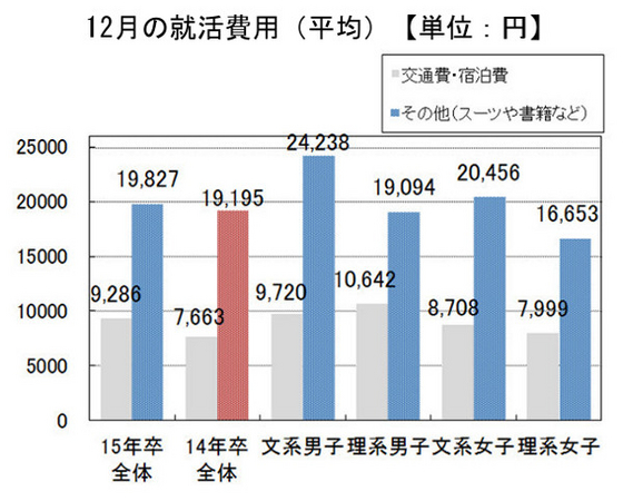 12月の活動量は前年よりやや多かったようだ。12月の平均エントリー社数は前年同月比3.3社増の44.3社となり、12月に集中的にエントリーが行われていた2014年卒の活動量を上回る結果となった。特に理系男子は前年同月比6.7社増の39.3社と目立って増加している。また、合同企業説明会で訪問した合計社数の平均も前年同月比1.9社増の14.1社と活発な様子がわかる。12月の就活費用(平均)は、「その他(スーツや書籍など)」が前年同月比632円増の19,827円だったのに対して、「交通費・宿泊費」も前年同月比1,623円増の9,286円と大きく増加していることから、積極的に企業との接触機会を増やしているようだ。