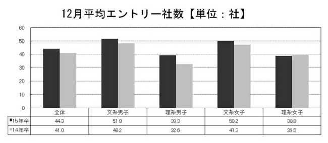 12月1日の採用広報活動解禁とともに、2015年卒の就職活動がスタートした。景気が回復傾向にある中、就職環境の好転により状況を楽観した学生の活動量低下が懸念されていたが、12月の平均エントリー数は全体で前年同月比3.3社増の44.3社となり、特に理系男子のエントリー数が前年同月比6.7社増の39.3社と大きく伸びた。人事担当者との接触も前年と比べて増加しており、企業側も前年以上に活発に採用活動を展開していることが推測される。就職環境好転の追い風に加えて、しっかりと準備を進めてきた学生が多いようで、内定を取る自信を強めている学生が増えた。先輩と比較して自分たちの環境が楽になると考える学生も前年よりも大幅に増えている。