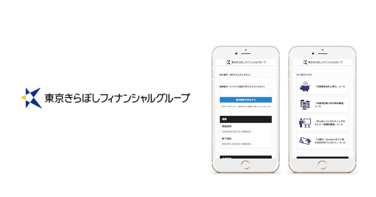 eギフトプラットフォーム事業(※1)を展開する株式会社ギフティ(本社:東京都品川区/代表取締役:太田 睦、鈴木 達哉/以下、ギフティ)は、株式会社東京きらぼしフィナンシャルグループ(本社:東京都港区/代表取締役社長 渡邊 壽信/以下、東京きらぼしFG)に、宝印刷株式会社(本社:東京都豊島区/代表取締役:堆 誠一郎/以下、宝印刷)と連携し、ギフティが提供する株主優待券を電子化し発行する「株主優待電子化システム」を基盤とする「ネットで優待」を提供いたしましたので、お知らせいたします。この度、電子化し発行された株主優待券は、東京きらぼしFGの子会社であるきらぼし銀行等が取り扱う金融商品の金利上乗せや手数料の優遇、デジタルギフトのプレゼントなど4つのコースから1つ選択可能な選択型優待であり、2024年7月1日(月)から2024年12月30日(月)までご利用いただけます。