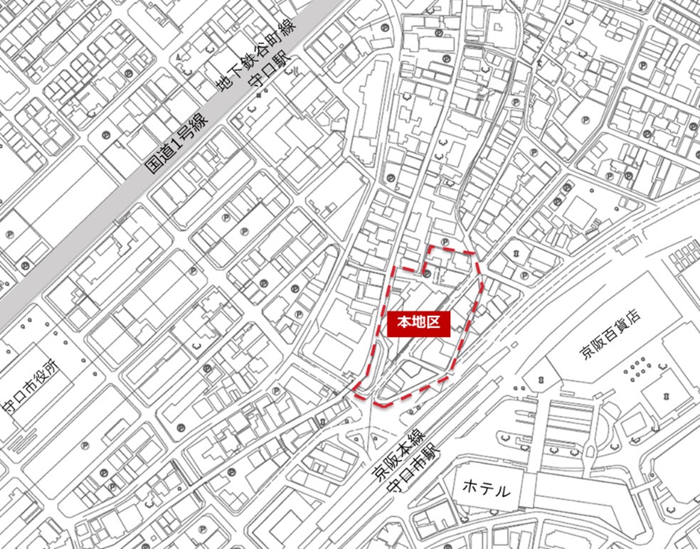 京阪本線「守口市」駅より徒歩1分に位置する守口市駅北地区(以下、「本地区」という)は、守口市立地適正化計画において、「守口都市核周辺誘導促進区域」に位置付けられており、商業、教育文化、地域交流機能の誘導の他、緑やオープンスペース、憩いの空間の創出、回遊性の確保により日常の賑わい ・活力を生み出すとともに、土地の高度利用を促進し、魅力ある拠点の暮らし等が都市機能誘導の施策として掲げられております。2023年3月には、守口市駅北側エリアリノベーション戦略が策定され、新たな街並みの形成が求められております。