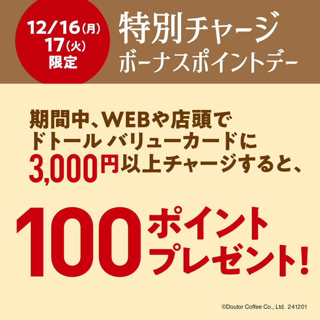 WEBや店頭でドトール バリューカードに3,000円以上のチャージをすると、通常のチャージポイント(ランクに応じて5%・7%・10%付与)に加え、もれなく100ポイントプレゼントします。