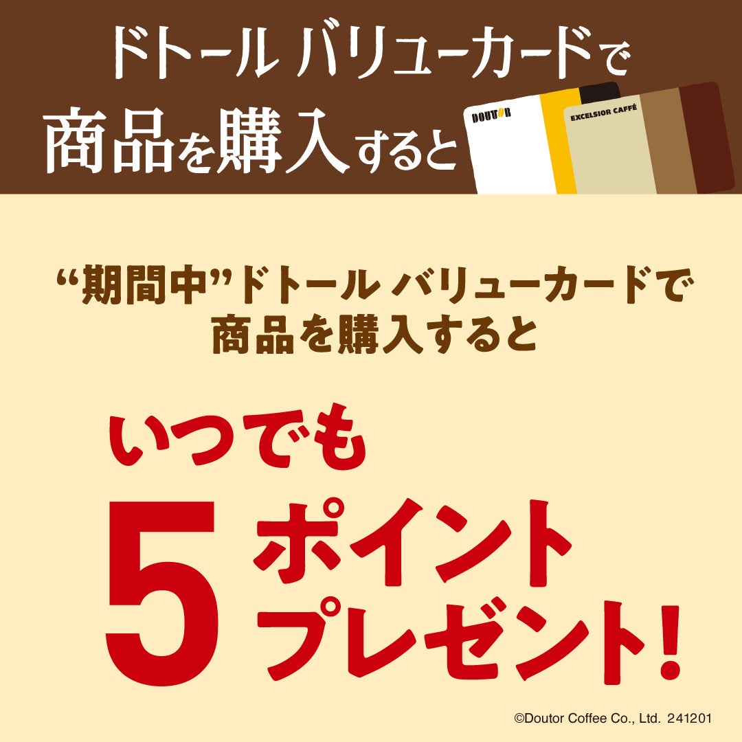 期間中、ドトール バリューカードで商品を購入すると、1会計ごとに5ポイントプレゼントします。