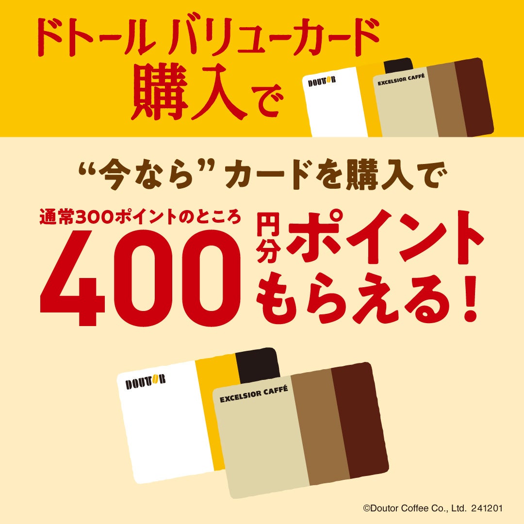 ドトール バリューカードを購入した際に付いてくる300ポイントが、期間限定で400ポイントになります。ドトール バリューカードは、全国のドトールコーヒーショップ、エクセルシオール カフェ等で販売しております。
