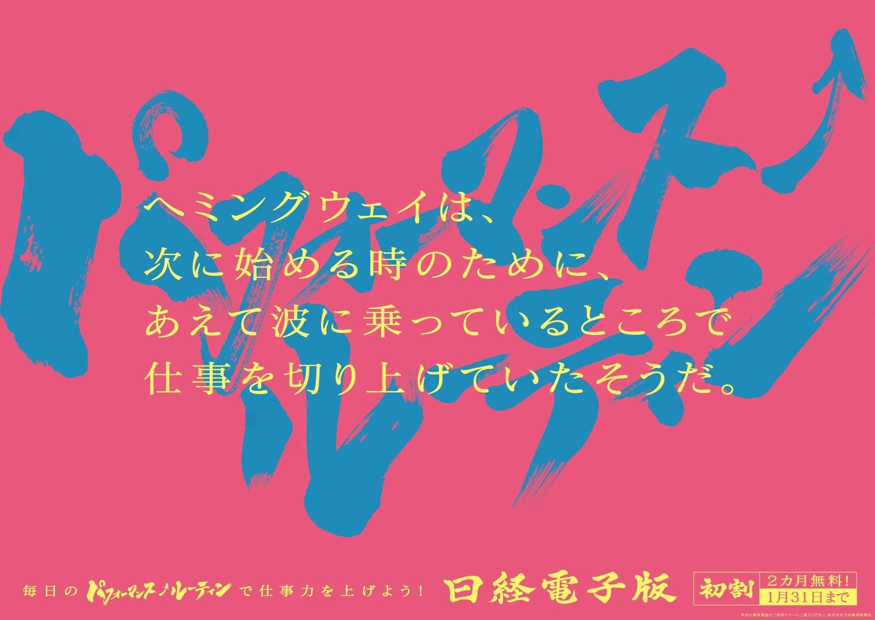 クリエーティブは「遠くから見ても読める、近くから見ても読める」というデザインギミックを施しており、遠くから見ると「パフォーマンスルーティン」が目に飛び込み、近づくと現代ビジネスパーソンや過去の偉人のルーティンが例示される形になっています。