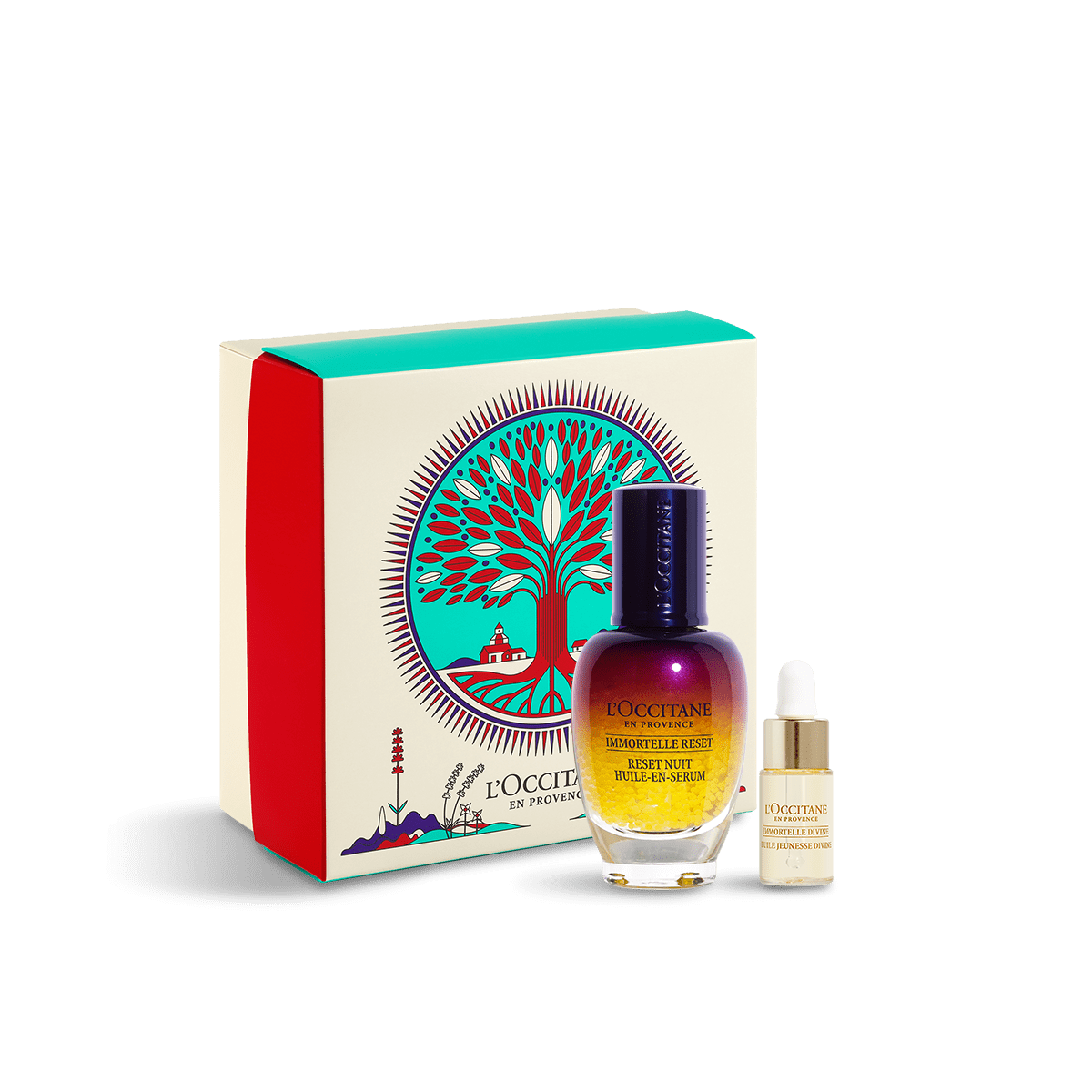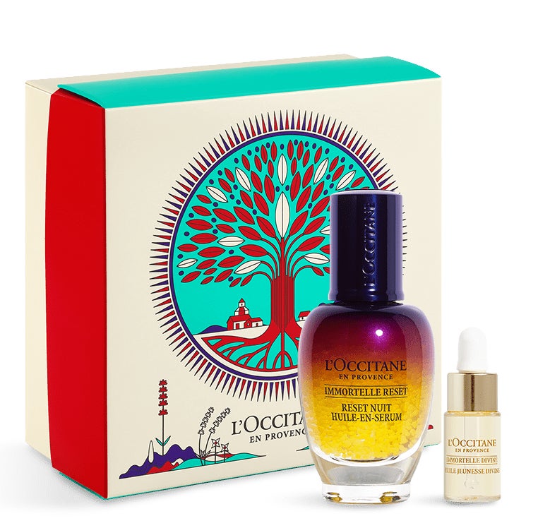 自分へのご褒美としてもおススメなのは、今、話題!の夜用美容液が入ったスキンケアのホリデー限定キット「イモーテル オーバーナイトリセットセラムスペシャル」。ぐっすり眠った翌朝のような、うるおい満ちる肌へ整える「イモーテル オーバーナイトリセットセラム」に、スキンケアを格上げする「イモーテル ディヴァインインテンシヴオイル(ミニサイズ)」のセット。オリーブツリーのイラストが可愛い、ホリデー限定デザインボックスに入れてお届けします。