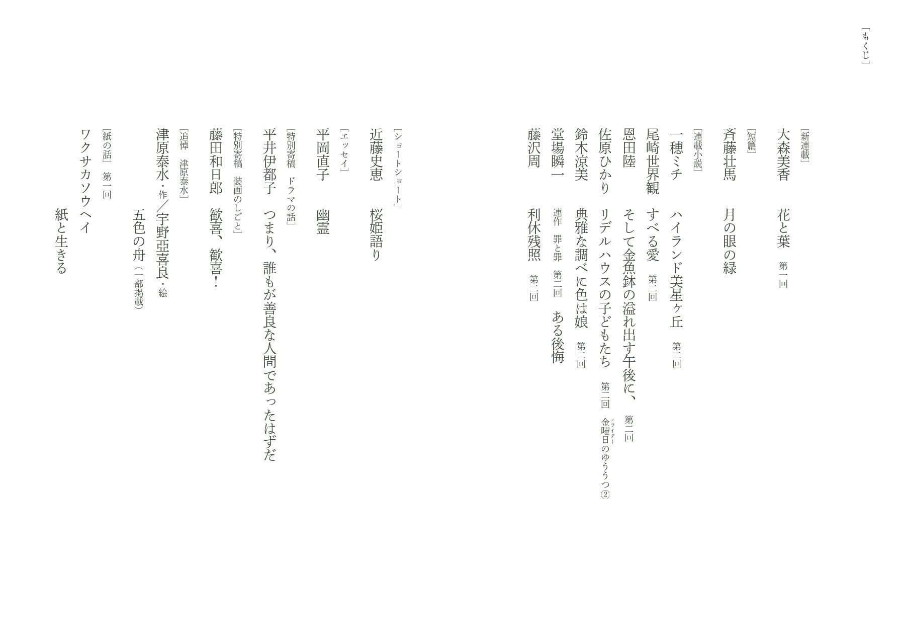 表紙の「ことば」は声優の斉藤壮馬さん。脚本家・大森美香さんのデビュー小説「花と葉」の連載がスタート。津原泰水・作/宇野亞喜良・画「五色の舟」一部掲載。