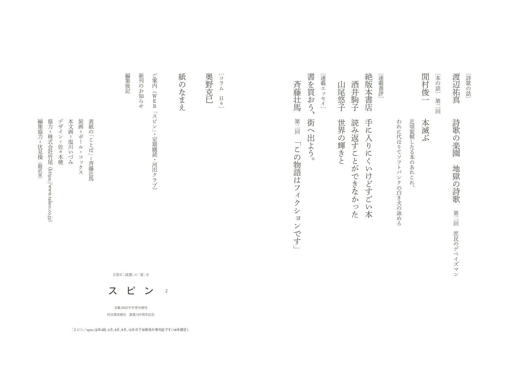 【創刊号は発売即重版!!】日常に「読書」の「栞(しおり)」を——オールジャンルの新雑誌「スピン/spin」第2号(12月22日発売予定)の表紙と目次を公開!