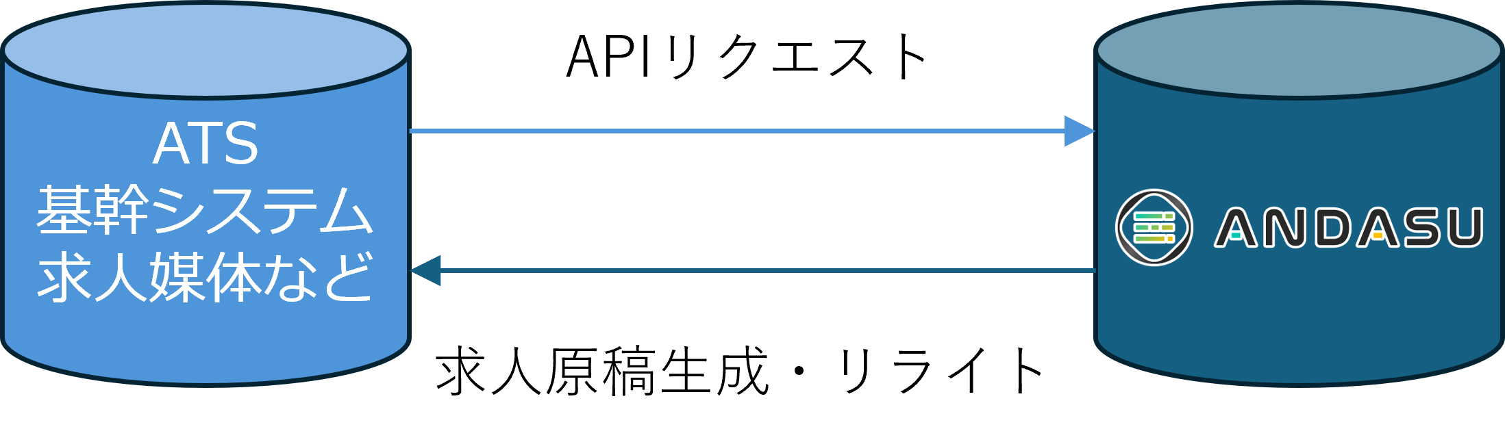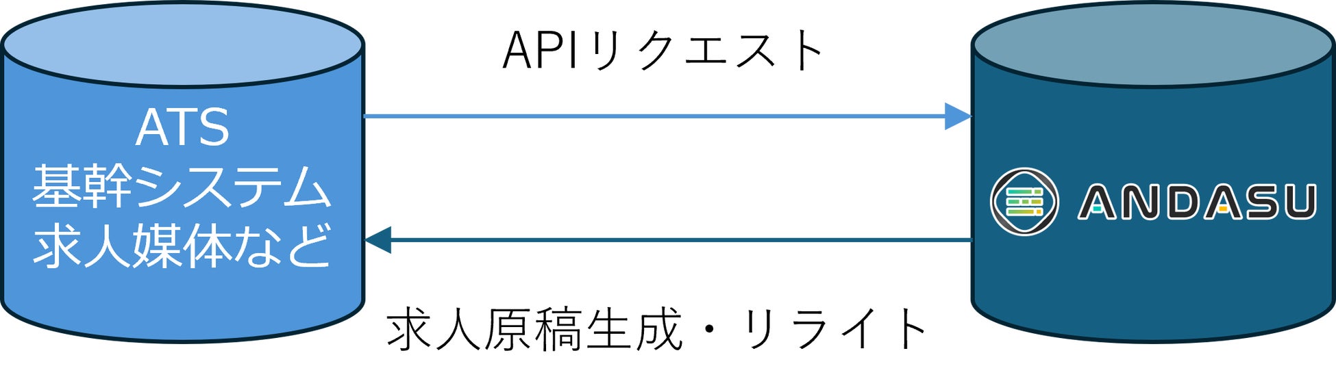ANDASUとシステム連携することで、ATSや自社の基幹システム、求人媒体などに入力した求人情報から、ワンタッチで求人作成やリライトを行うことが可能になります。