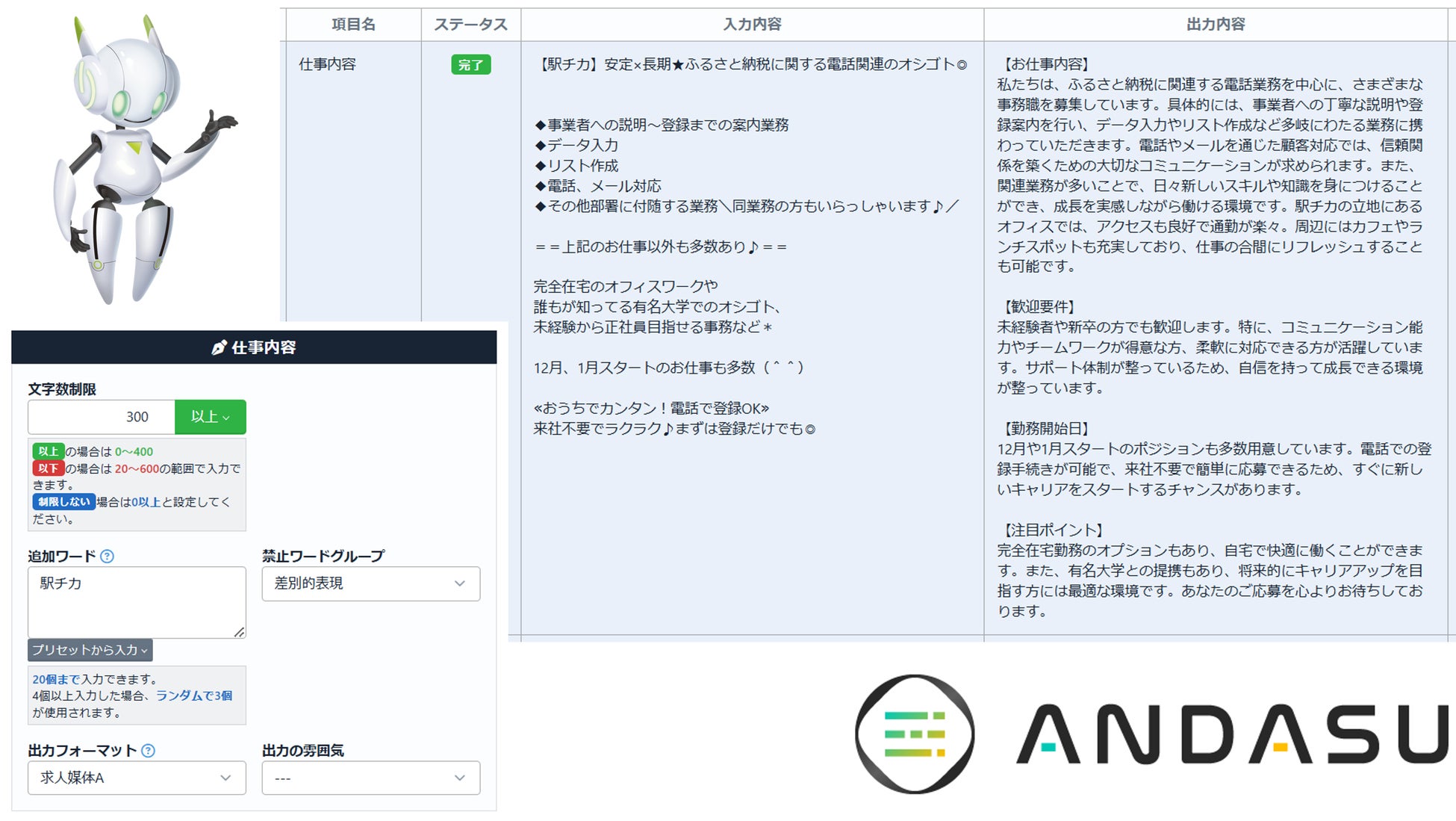 AIで求人原稿を自動生成・リライトする「ANDASU」(アンダス)、システム連携用APIを公開