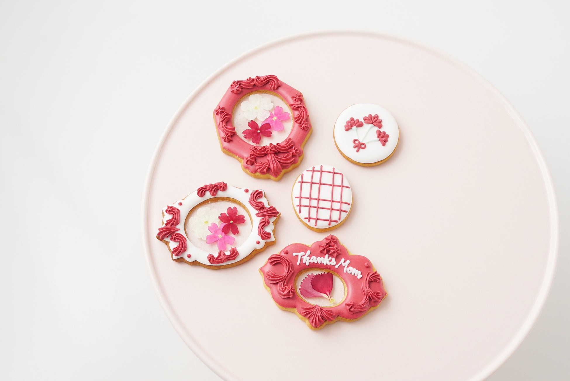 一つ一つ丁寧に手作りされたアイシングクッキーを額縁に見立てて、その中に飴を流し込み、まるで絵画のようにエディブルフラワーを美しく飾りました。
