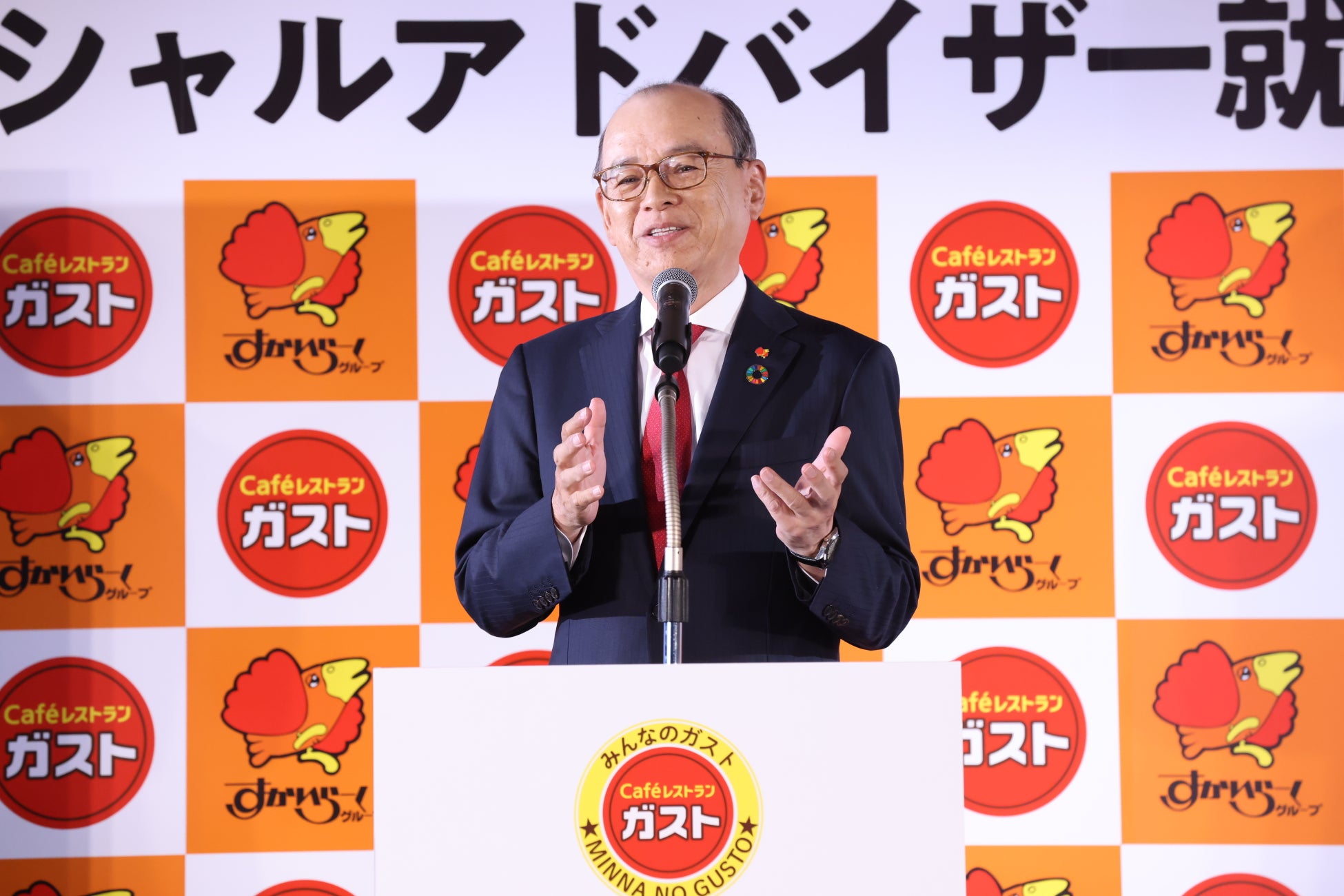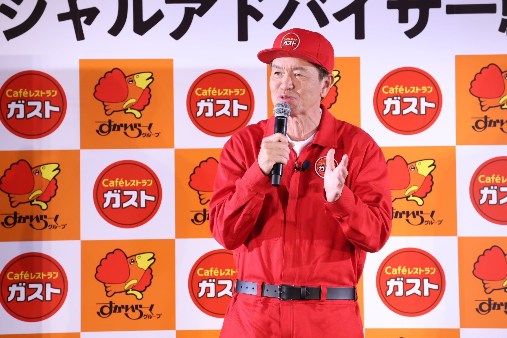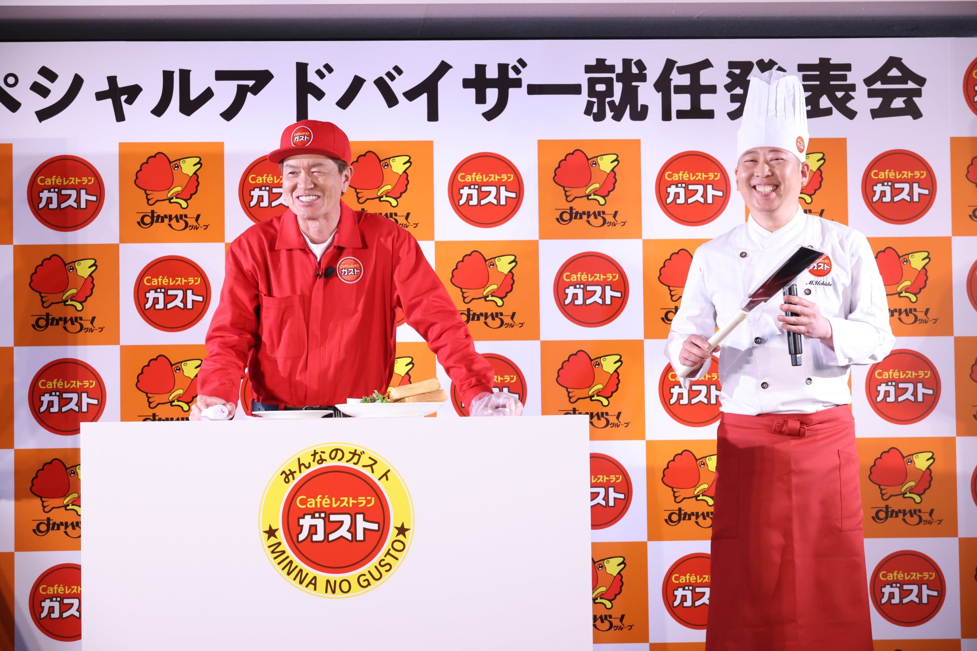 発表会冒頭では、谷会長が、「ヒロミさんは、およそ40年前にオープンした「すかいらーく八王子横川店」の頃から生活の中の一部としてご愛用頂いていたとのことで、驚きました。」とヒロミさんとの意外な繋がりを説明。さらに、「ヒロミさんご自身がガストに通われた際の美味しかったメニューなど思い出しながら、考案いただきました。これからヒロミさんとたくさんのアイデアを形にしていきたいと考えています。」とスペシャルアドバイザーに就任するヒロミさんへの期待を語りました。
