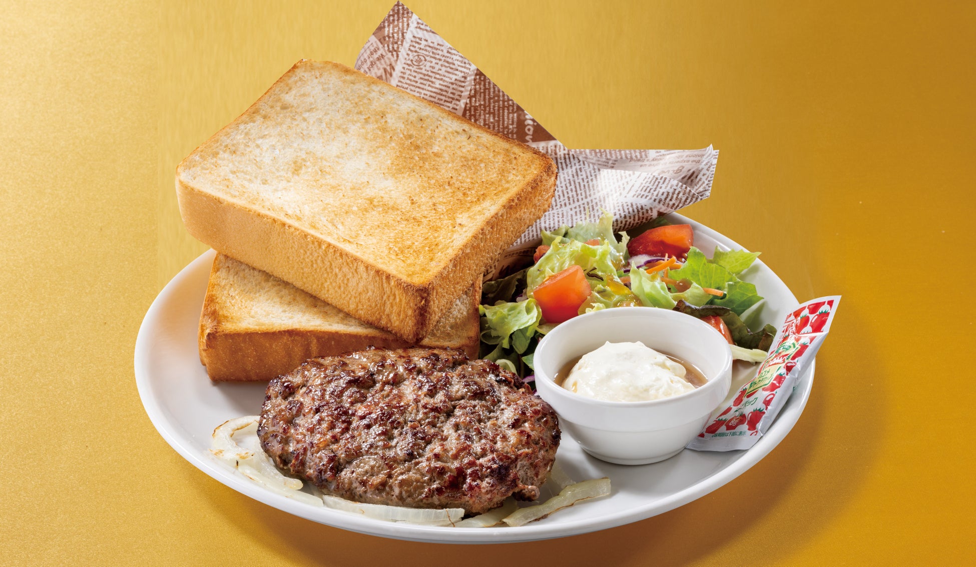 ビーフ100%の肉々しいハンバーグを厚切りパンに挟むとおいしさが倍増。