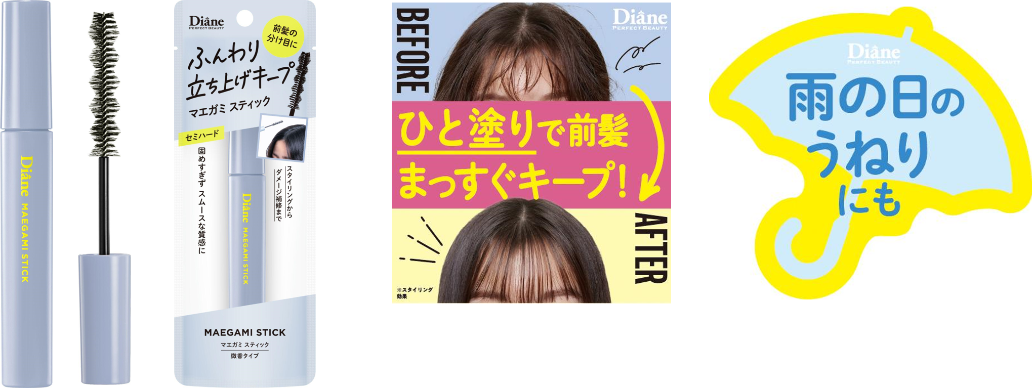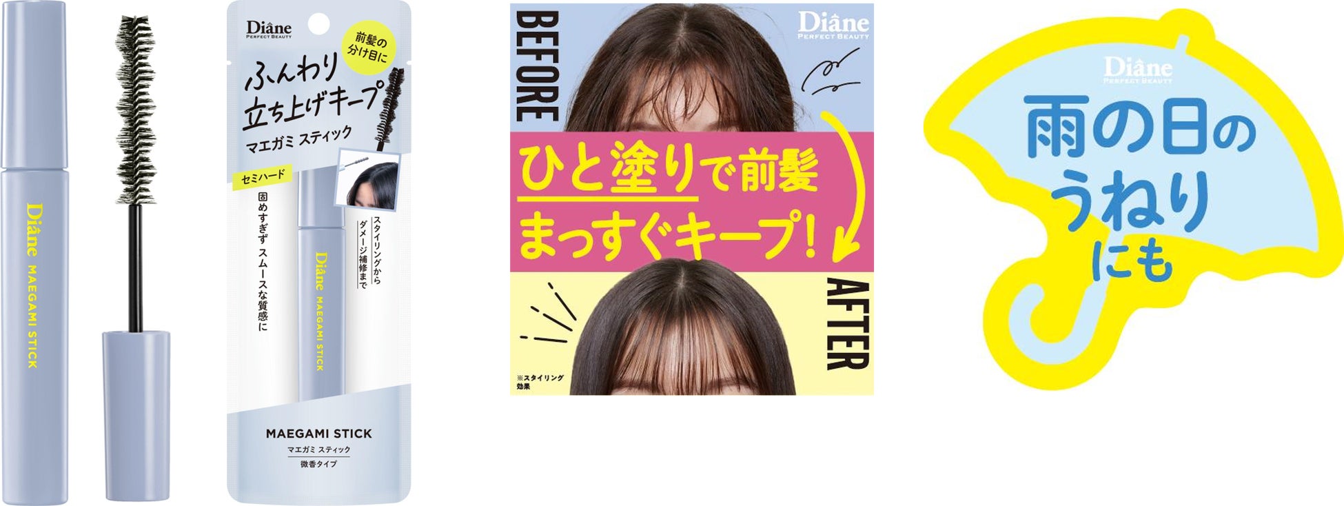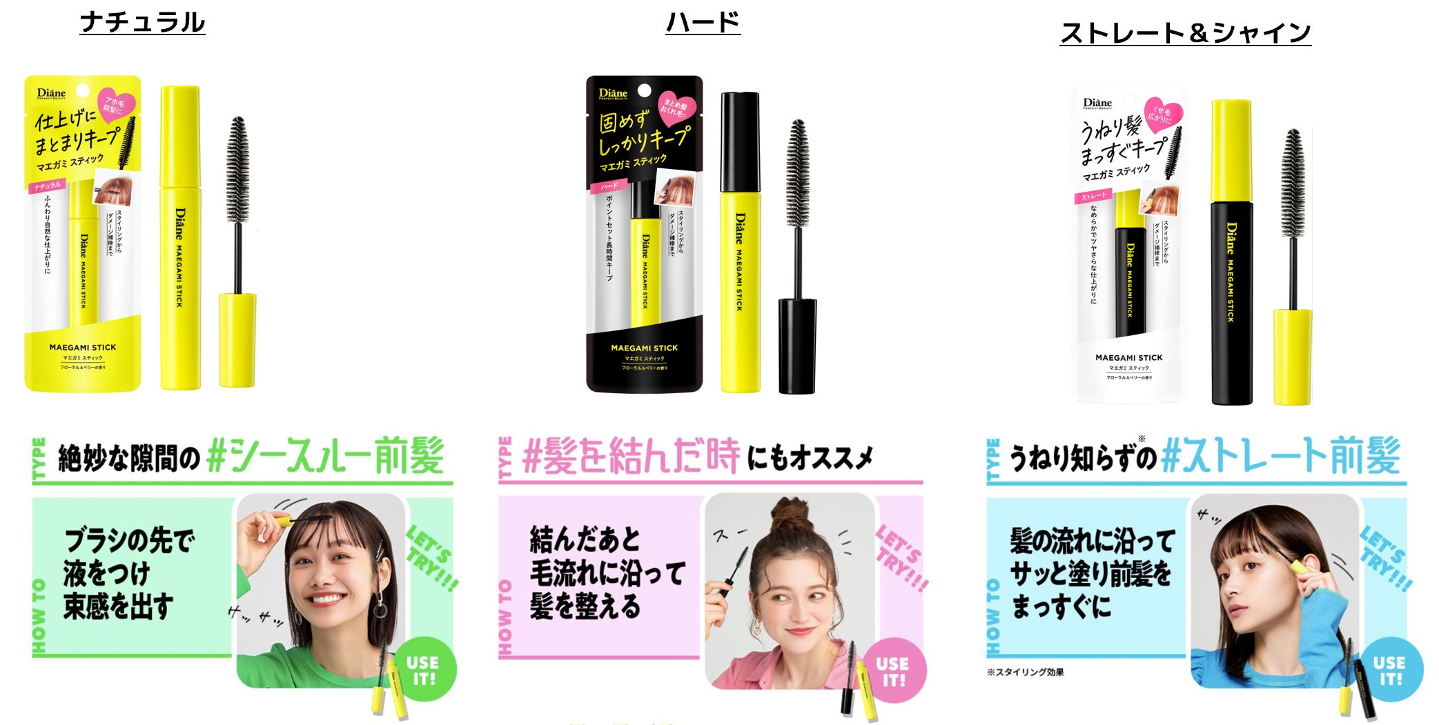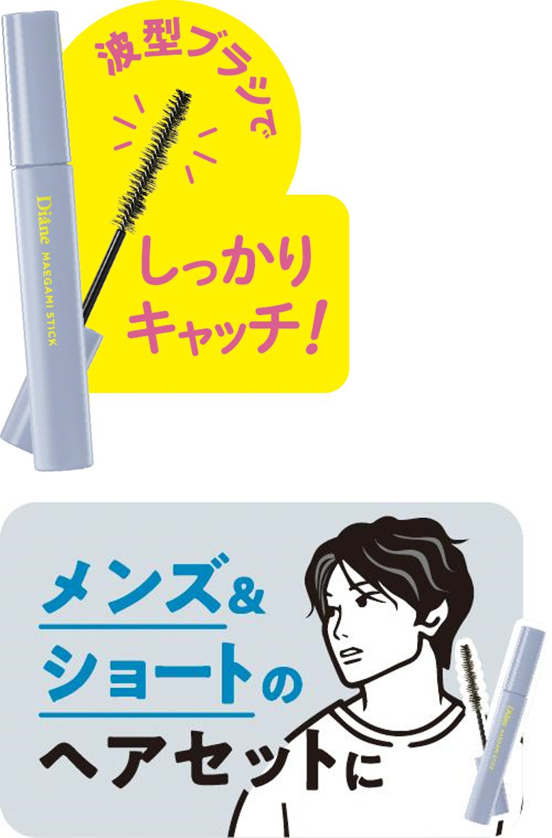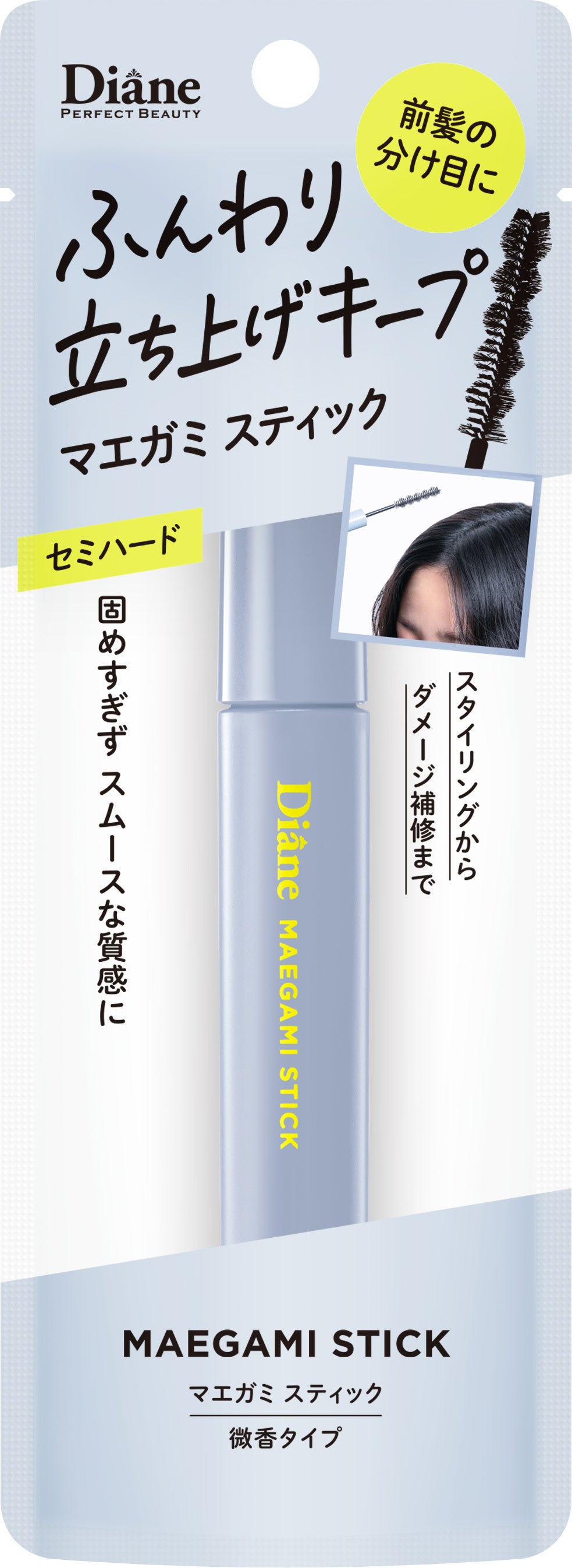 「マエガミスティック」は、スタイリングの仕上げにひと塗りすることで前髪を整え、長時間スタイルキープが可能なジェルタイプのスティックです。「ふんわりセット派」「しっかりキープ派」「うねり知らず派」「まとまりキープ派」など様々なニーズに答えるアイテムを展開しており、発売当初より多くの反響とともに各メディアで多くのアワードを受賞しています。