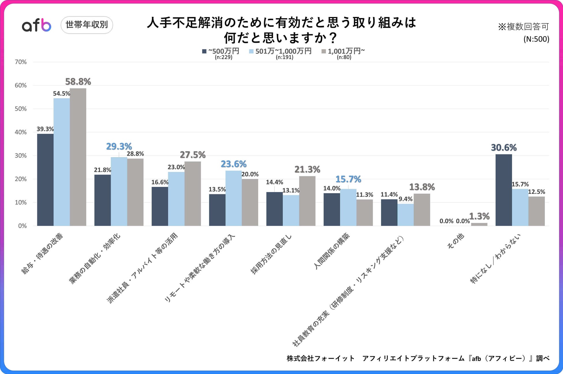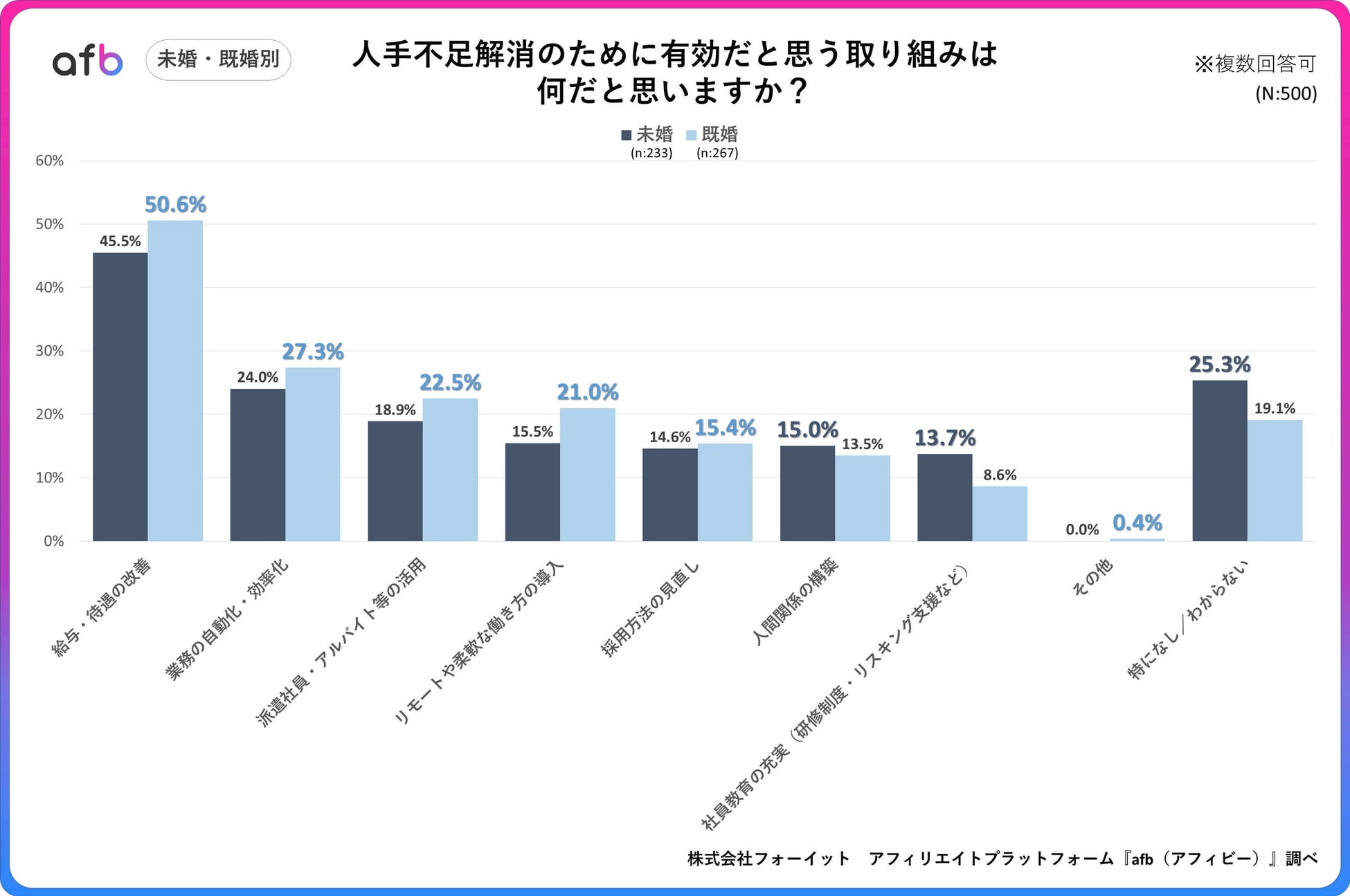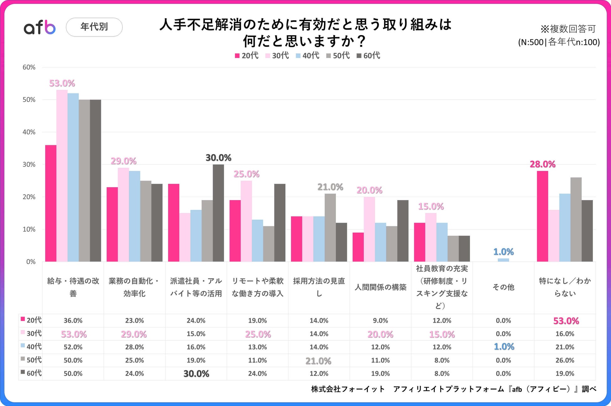 アフィリエイトプラットフォーム「afb(アフィビー)」< https://www.afi-b.com/ >の開発運用をおこなう株式会社フォーイットは、全国の20代~60代までの男女500人を対象に人手不足に関するアンケートを実施し、年代別等の特徴についてまとめました。