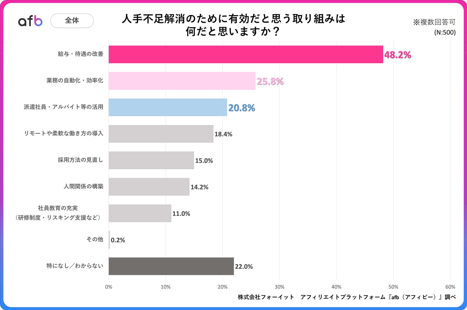全国の20代〜60代の男女を対象に、「人手不足解消のために有効だと思う取り組みは何だと思いますか?」というアンケートを実施したところ、最も多かった回答は「給与・待遇の改善」で48.2%でした。次いで、「業務の自動化・効率化」が25.8%、「派遣社員・アルバイト等の活用」が20.8%で続くという結果になりました。