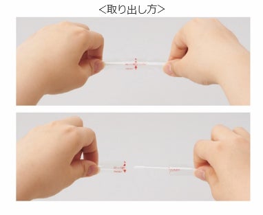 開封時は、袋の真ん中の切り込み部分をねじって切り、綿棒を取り出します。片方を袋で包んだまま使用でき、より衛生的です。