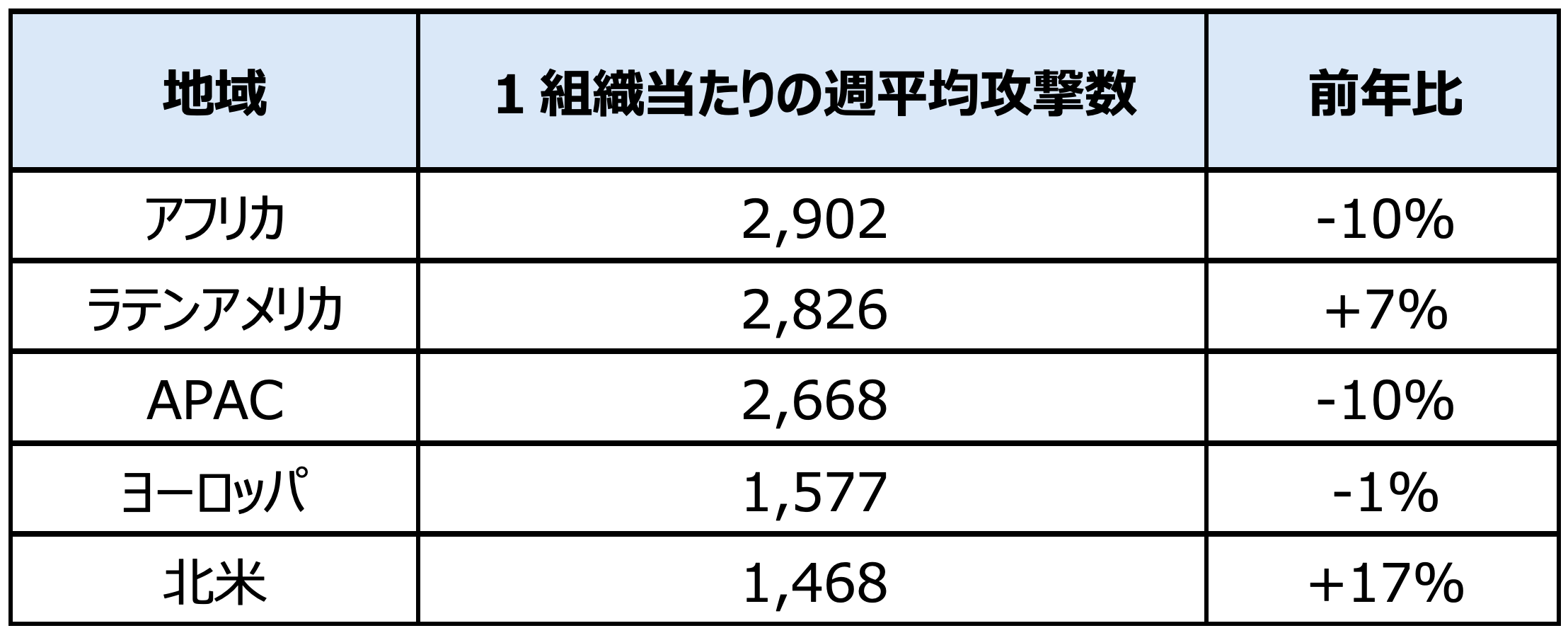 ラテンアメリカがこれに僅差で続き、週平均2,826件(前年比7%増)、アジア太平洋地域(APAC)は同2,668件(前年比10%減)でした。