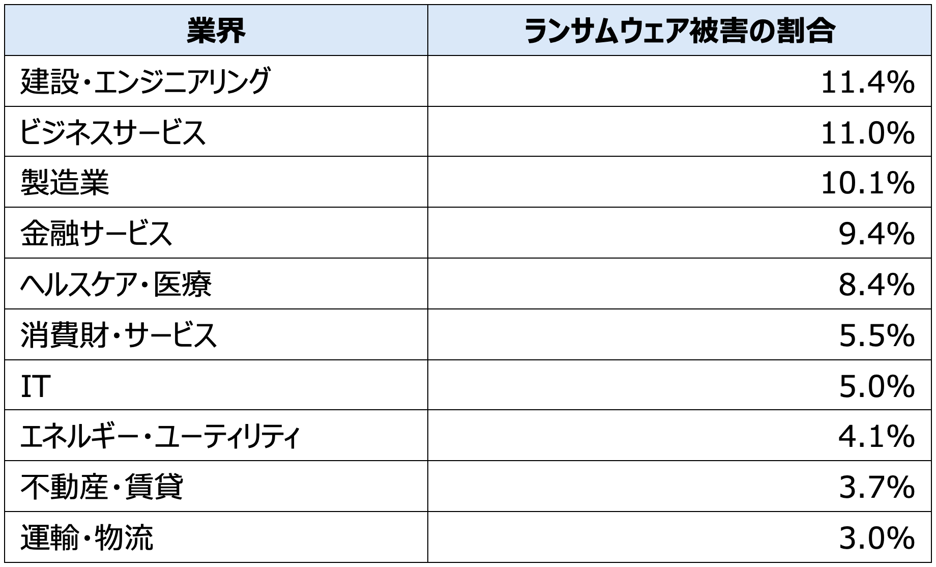 金融サービス(9.4%)、ヘルスケア(8.4%)、消費財(5.5%)などの他の主要分野も引き続き大きな標的となっており、ランサムウェアにおいて多様化が続いていることを反映しています。