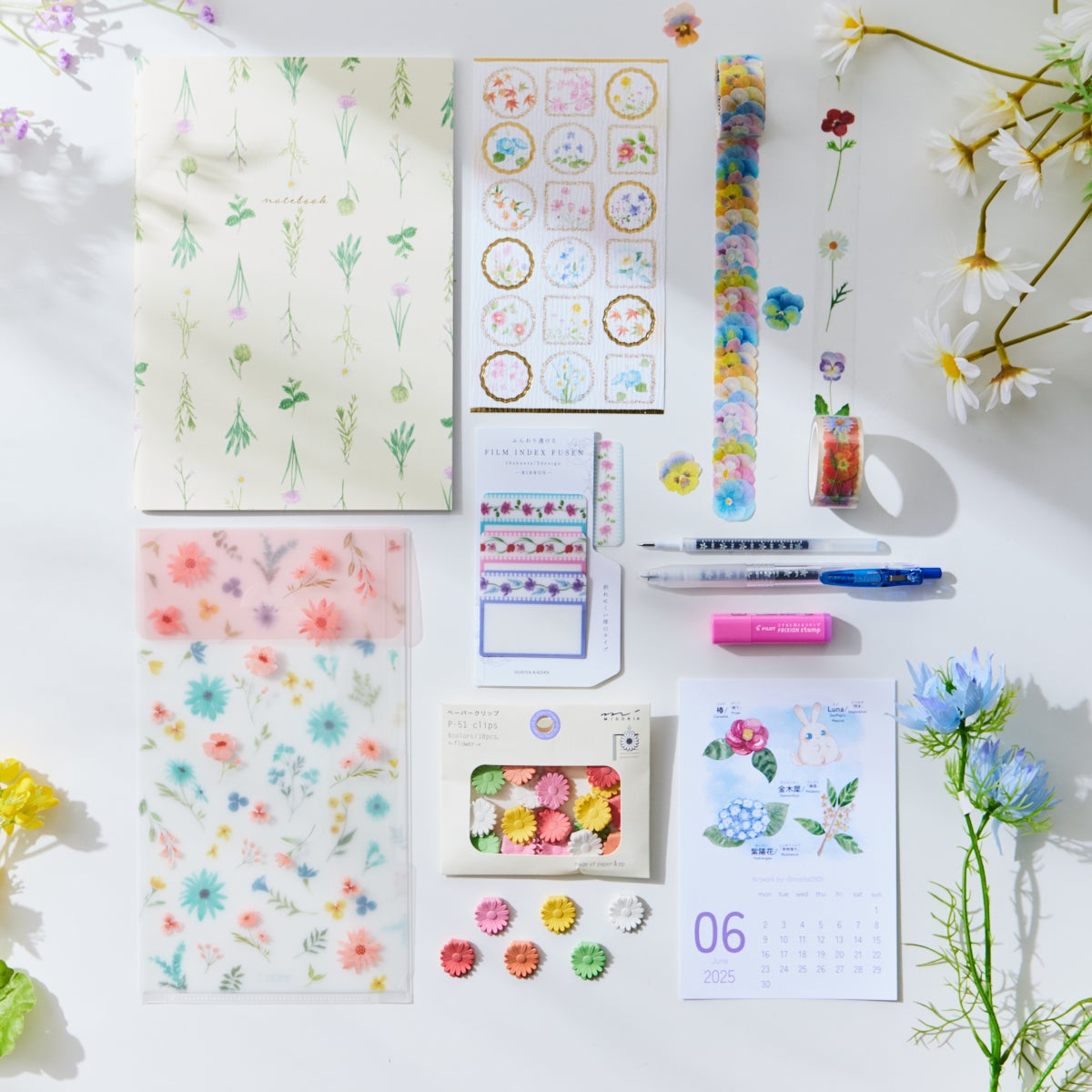このほかにも、芯部分に小さなお花がプリントされた限定版のサラサペンや、1枚ずつ異なるデザインのステッカーとして使えるbandeのマスキングテープなど、個性豊かなアイテムをラインナップ。花に込められた想いをそっと届けるような、季節感あふれる文房具セットです。
