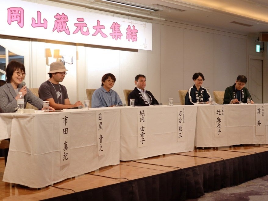 今回で3回目の開催となる「岡山蔵元大集結」では、『雄町の酒の魅力を米作りから考える』をテーマに、雄町の生産者から、まめ農園 目黒貴之氏、穂々笑ファーム 堀内由希子氏、蔵元の杜氏からは、十八盛酒造 石合敬三氏、辻本店 辻麻衣子氏、落酒造場 落昇氏が登壇し、トークセッションが行われました。その後、岡山県内 14 蔵による試飲会が開かれ、約200名の酒類流通関係や料飲店等の方が蔵元からの説明を聞いたり情報交換したりしながら、岡山の日本酒を愉しみました。