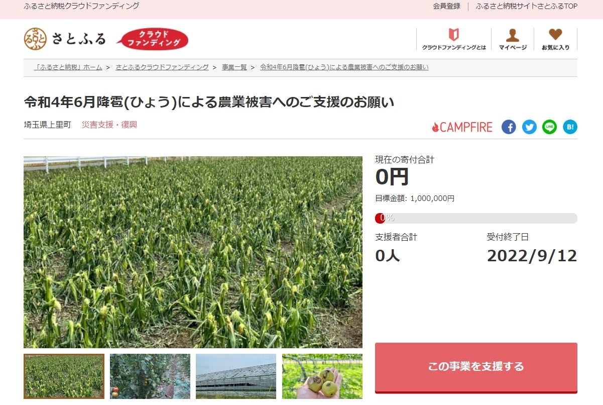 埼玉県上里町とさとふる、降雹(ひょう)による農作物被害を受けた農業者を支援するため、寄付受け付けを開始