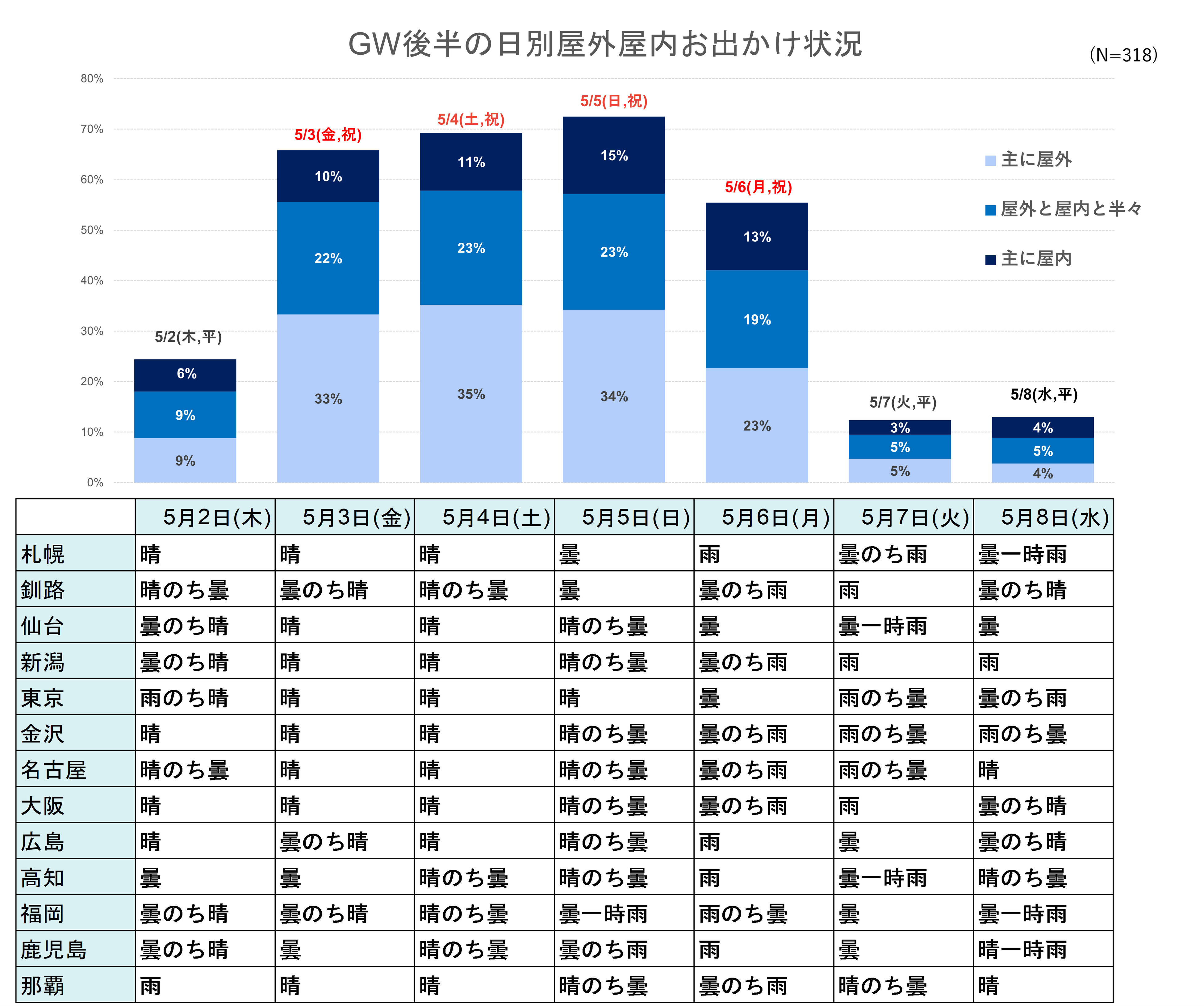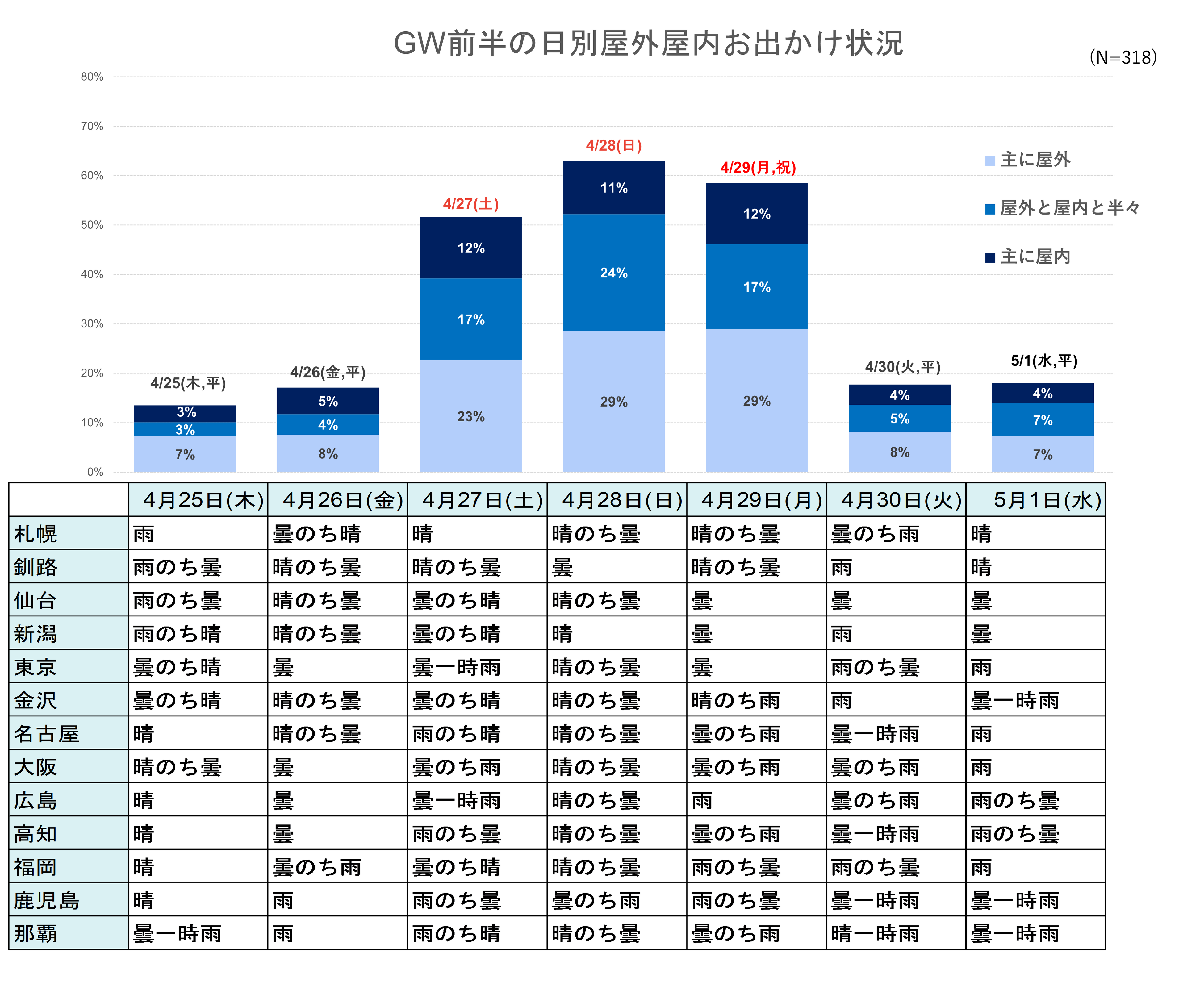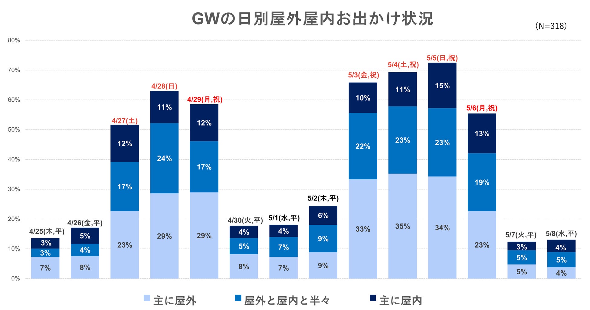 全国的にお天気に恵まれた4/28(日)、5/3(金・祝)、5/4(土)は、やはり屋外のお出かけ率が高く、屋内に出かけたという人は20%以下となりました。