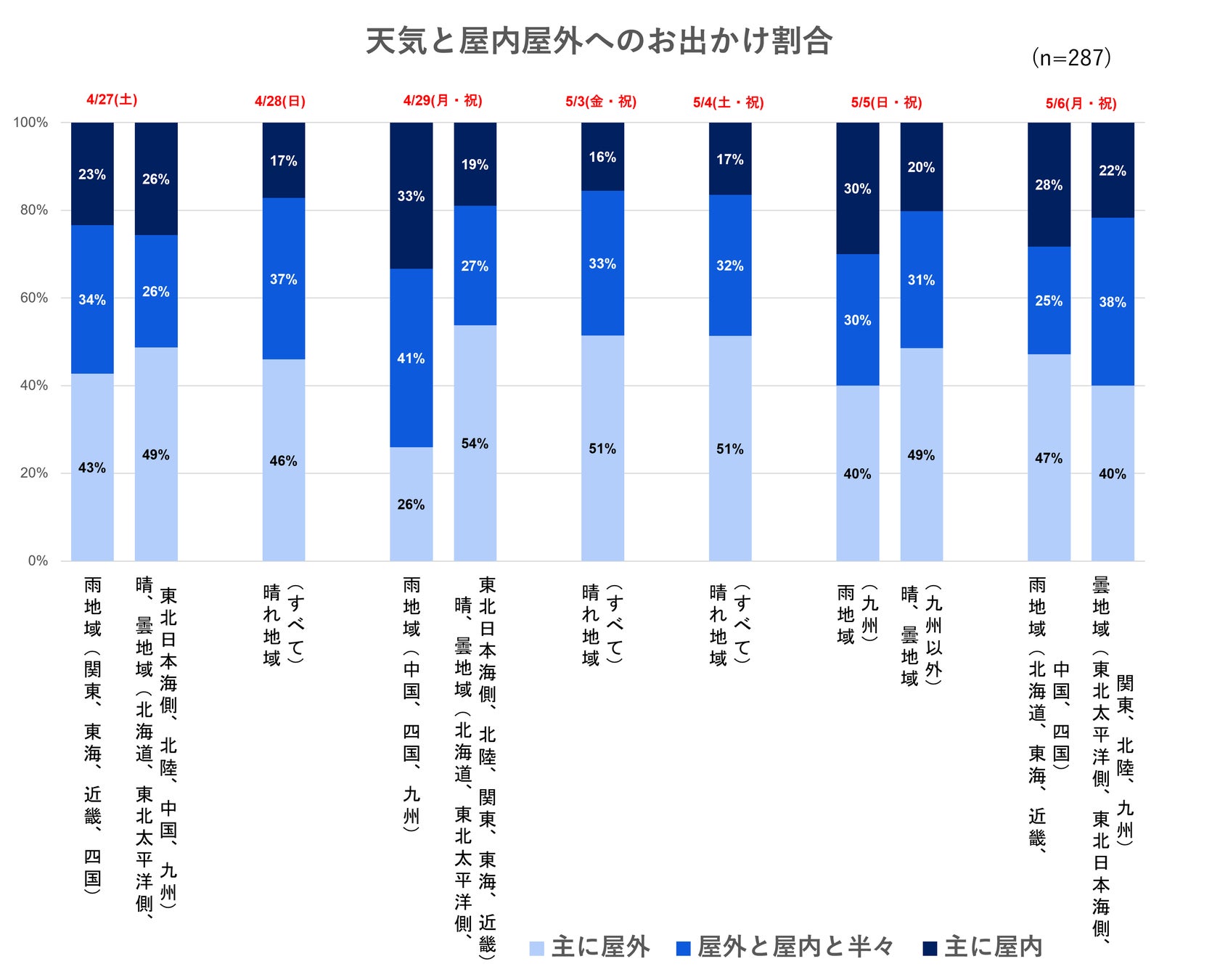 4/27(土)、4/29(月・祝)、5/5(日・祝)は雨と晴れの地域に分かれましたが、比較して見ると、晴れ地域の方が屋外に出かける率が高いことがわかります。特に29日と5日は、雨と晴れの地域でお出かけの様子に明らかな違いが見られました。