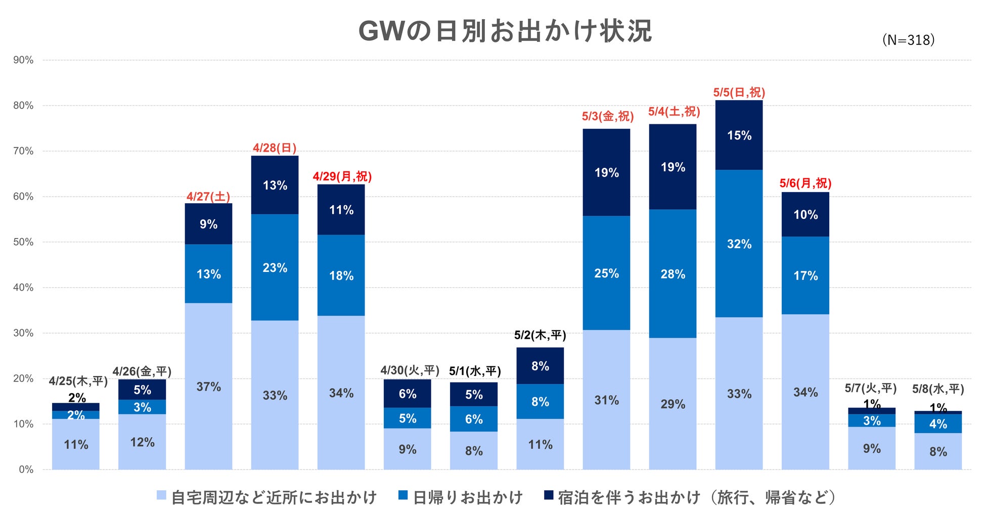 GWのどの日に実際にお出かけしたのかを聞いた質問の結果が以下のグラフです。