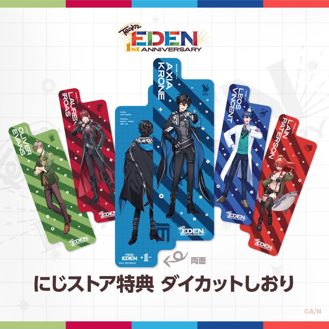 「エデン組 1st Anniversary」のグッズを、にじさんじオフィシャルストアにて3,000円(税込)以上ご購入の方に、特典しおりをランダムで1枚プレゼント!