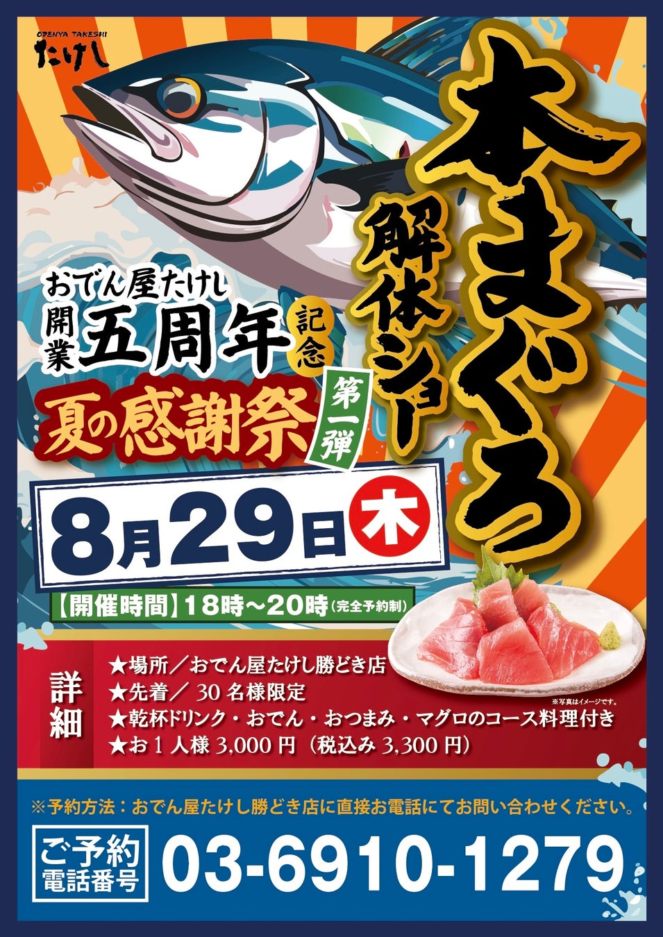 「おでん屋たけし」 開業五周年記念 夏の感謝祭 第一弾は、8月29日(木)勝どき店にて、「おでん屋たけし」 では初となる 「本まぐろ解体ショー」 を開催! 豊洲より仕入れた、新鮮な本まぐろ一本丸々解体していく迫力の解体ショーを間近で御覧いただき、捌きたての本まぐろ特別コース料理をお1人様3,300円(税込)にてご提供させていただきます!※完全予約制、先着30名様限定