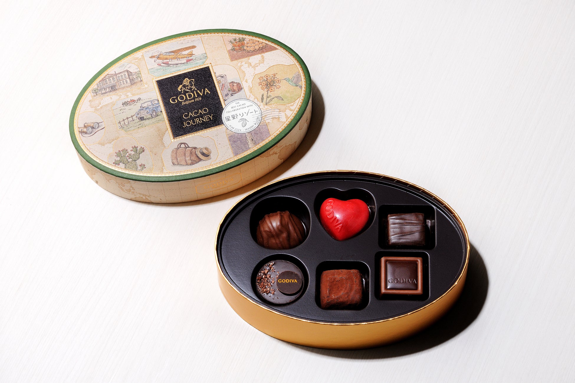 ゴディバのシェフが、5つのカカオの産地を想いながら創り上げた「ゴディバカカオ ジャーニー」コレクションのチョコレートを「旅」をイメージしたイラストにスタンプ⾵の星野リゾートのロゴがアクセントになっている共同企画限定のパッケージに詰め合わせました。