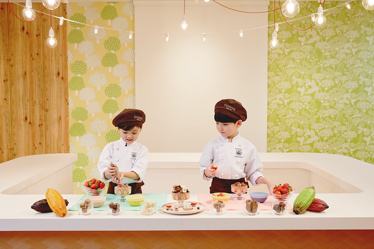 リゾナーレでは、「キッズスタジオ」にて季節のフ ルーツとゴディバのチョコレートを使ったバレンタイン限定のオリジナルスイーツを作ることができます。ゴディバの帽⼦をかぶり本格パティシエの気分になったお⼦さまが作るバレンタインスイーツをご家族で⼀緒に味わえます 。