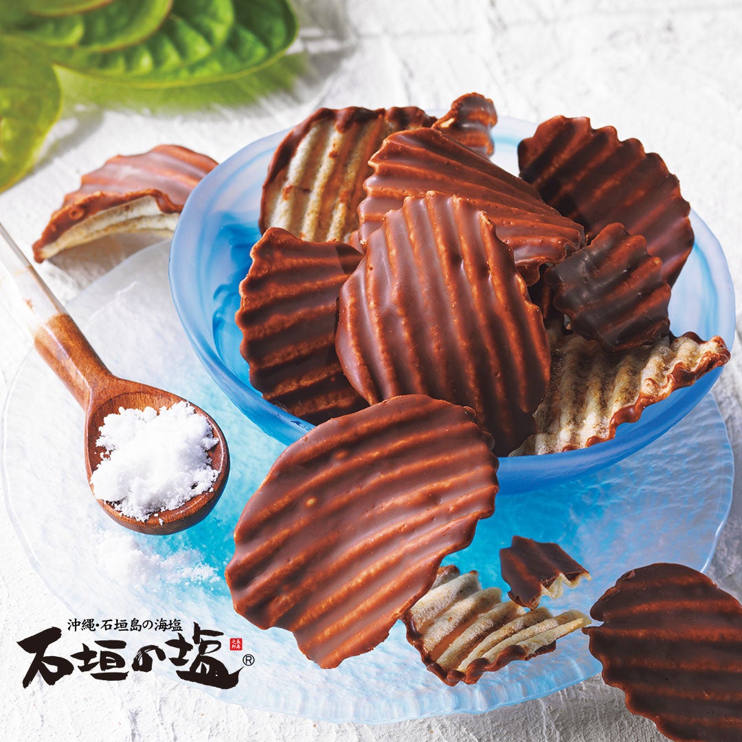 「石垣の塩」を使ったポテトチップの片面に、口どけの良いチョコレートをコーティング。まろやかで旨みのある塩味がポテトチップのかろやかな食感とともに広がり、チョコレートのやさしい甘さと絶妙にマッチします。