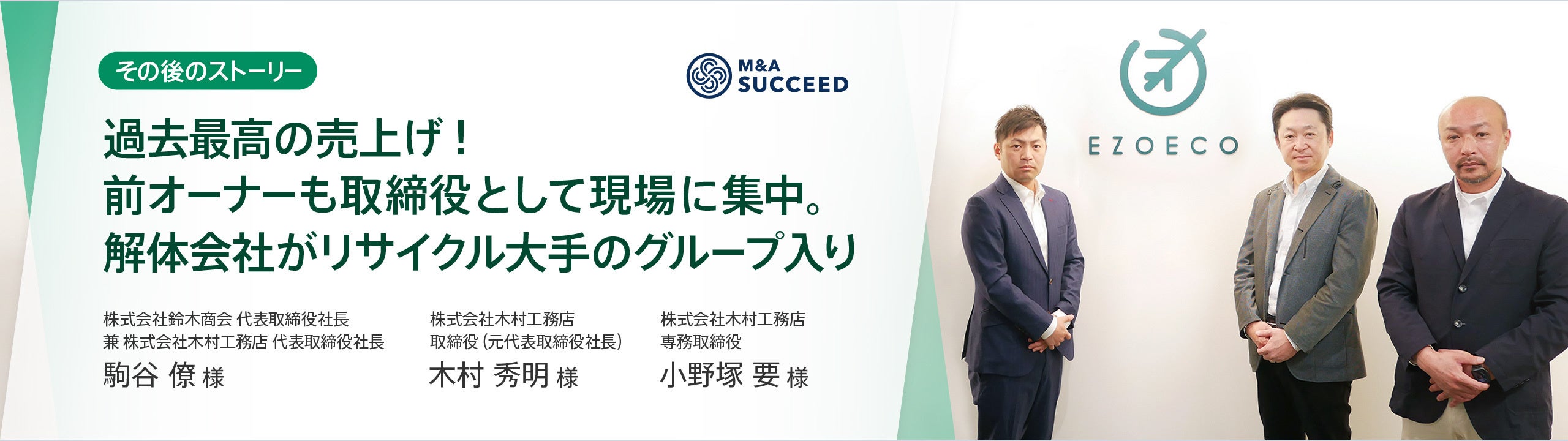 Visionalグループの株式会社M&Aサクシード(所在地:東京都渋谷区/代表取締役社長:金 蓮実)が運営する法人・審査制M&Aマッチングサイト「M&Aサクシード」(https://ma-succeed.jp/)を通じて、資源のリサイクル総合企業の株式会社鈴木商会(所在地:北海道札幌市、以下:鈴木商会)は、2021年7月に、解体工事、産業廃棄物処理を手がける株式会社木村工務店(所在地:北海道釧路市、以下:木村工務店)を譲り受けました。その約1年後に、木村工務店は過去最高の売上高を記録しました。そこで、このたび、その後の状況と今後について二社の対談を公開しました。