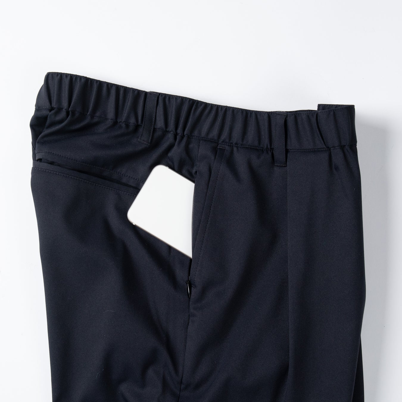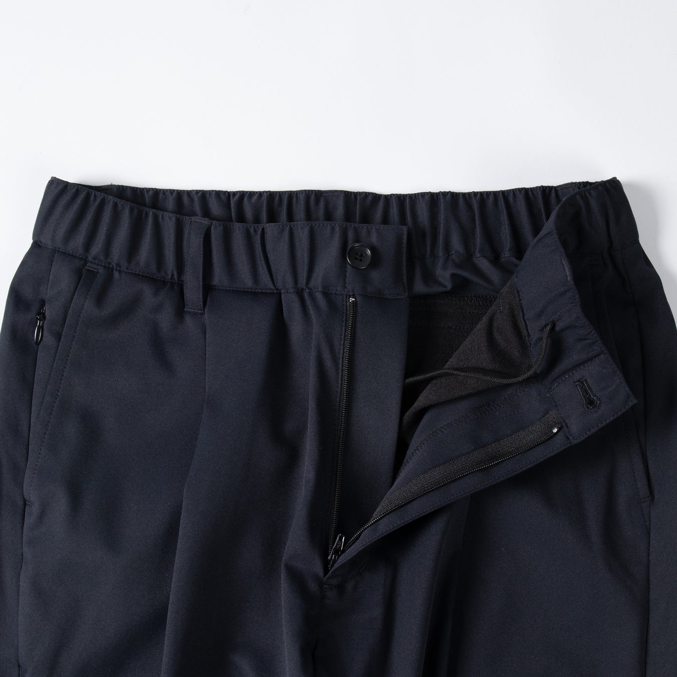 特徴:洗濯機で丸洗いでき、シワになりにくい独自開発素材「ultimex」を使用。ウエストゴムとドローコード付き。ワンタック入りで、足先にかけて綺麗なラインで穿けるテーパードに仕上げました。カジュアルなスタイリングに合わせやすいよう丈感は従来品のフルレングスよりやや短め。見た目に響かないコンシールファスナーを使用したポケット2つを含め、計5つのポケットを配置しました。