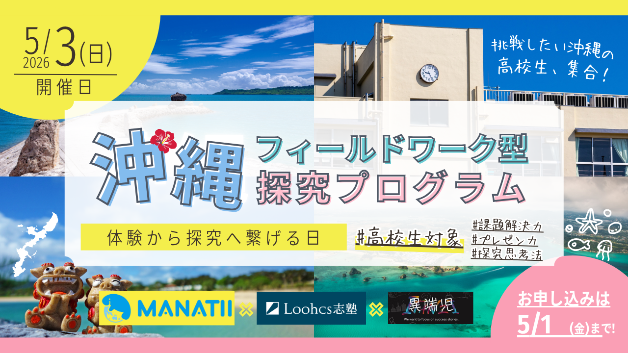 Loohcs志塾沖縄校(所在地:沖縄県那覇市)は、「一般社団法人マナティ」と「異端児」連携し、「沖縄フィールドワーク型探究プログラム」を2026年5月3日(日)に宮城島(うるま市)にて実施します。本プログラムは、海洋ごみ問題をはじめとする沖縄の環境問題・地域課題をテーマに、現地での一次体験と探究学習を組み合わせた「社会につながる探究」を実践する教育プログラムです。