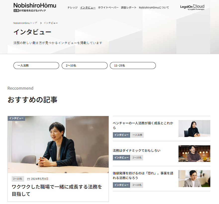 メインコンテンツの「インタビュー」では、「法務の新しい働き方が見つかる」をキーワードに、法務機能の規模を問わず、さまざまな現場で働く法務担当者の事業成長に貢献する法務の働き方や、課題の乗り越え方を紹介しています。