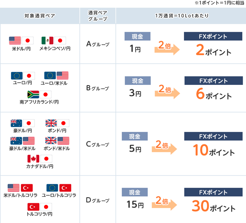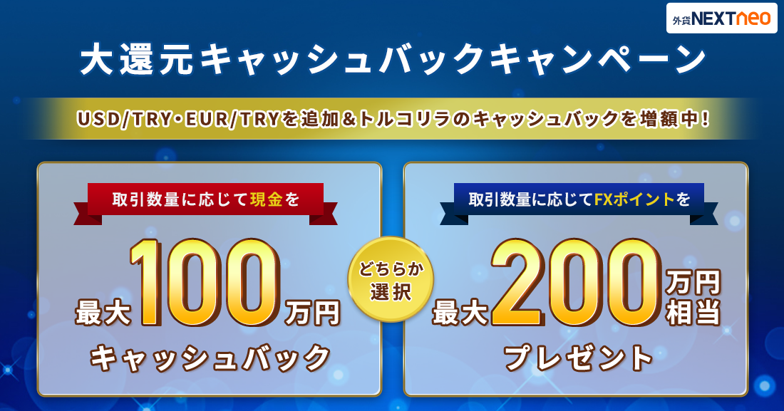 対象期間中の『外貨ネクストネオ』における指定通貨ペアの新規注文の取引量に応じて、最大200万円相当のFXポイント、もしくは現金100万円のキャッシュバックをいたします。