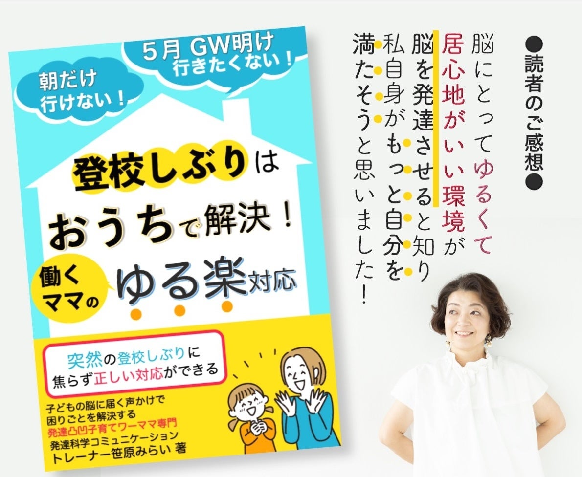 はじめまして 発達科学コミュニケーショントレーナー笹原みらいです。働く罪悪感をゼロにして子どもと過ごす時間が少ないワーママが子どもと過ごす時間の質を高めて親子の会話で子どもの脳の発達を加速する発達凸凹子育て✖️ワーママ専門講座の講師として活動しています。この度は、働くママが5月のGW明けに突然始まる子どもの登校しぶりの正しい対応がわかる本「登校しぶりはおうちで解決!働くママのゆる楽対応」をリリースいたしました。