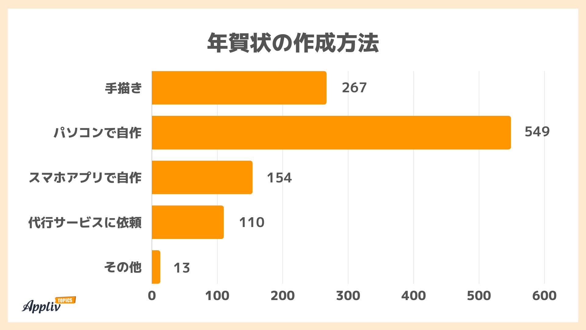 年賀状を「送る」と回答した865人に、年賀状の作成方法(複数選択可)を尋ねました。最多は「パソコンで自作」で549人。次点の「手描き」267人と2倍以上の差をつけています。
