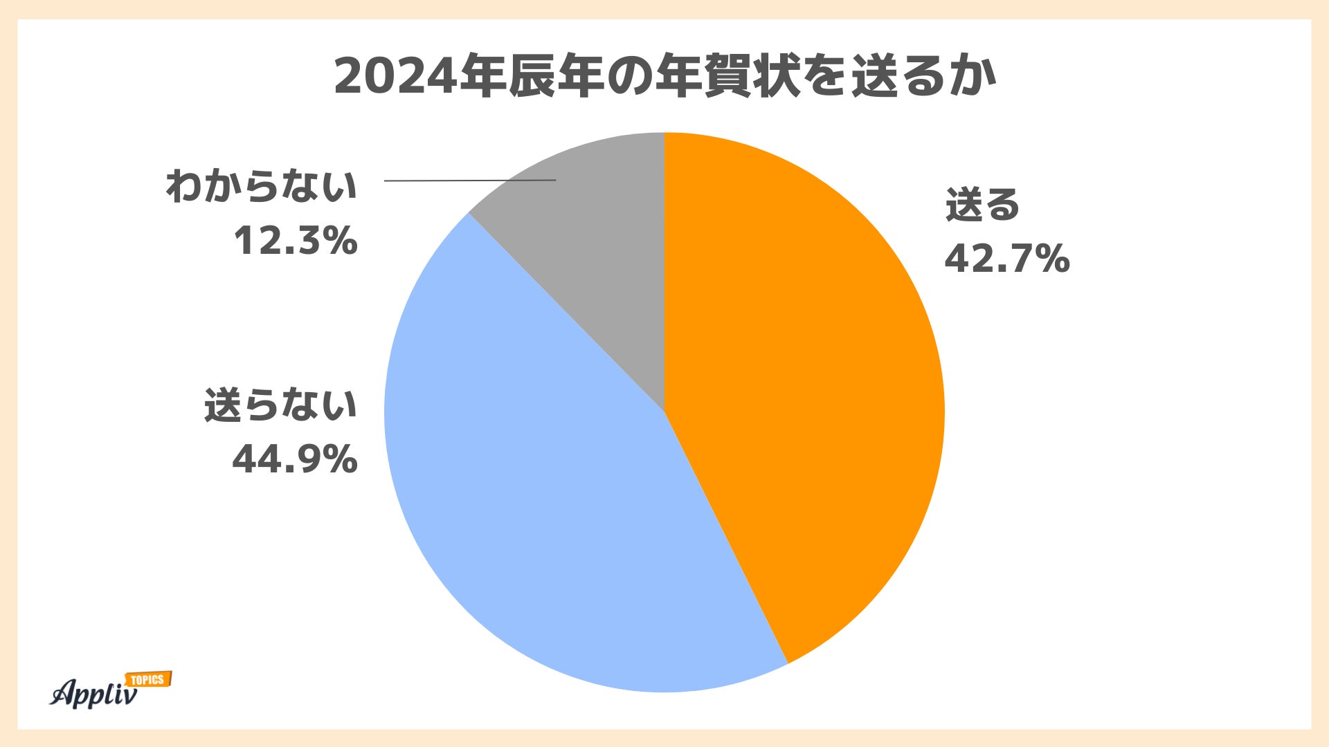 2024年辰年の年賀状を「送る」42.7%、「送らない」44.9%。