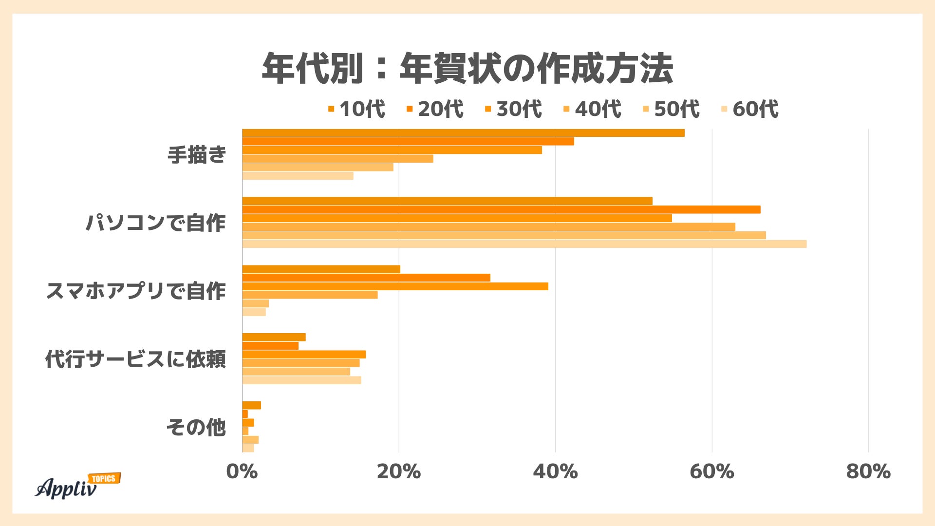 年賀状の作成方法は「パソコンで自作」が最多。特に60代の割合が大きい。