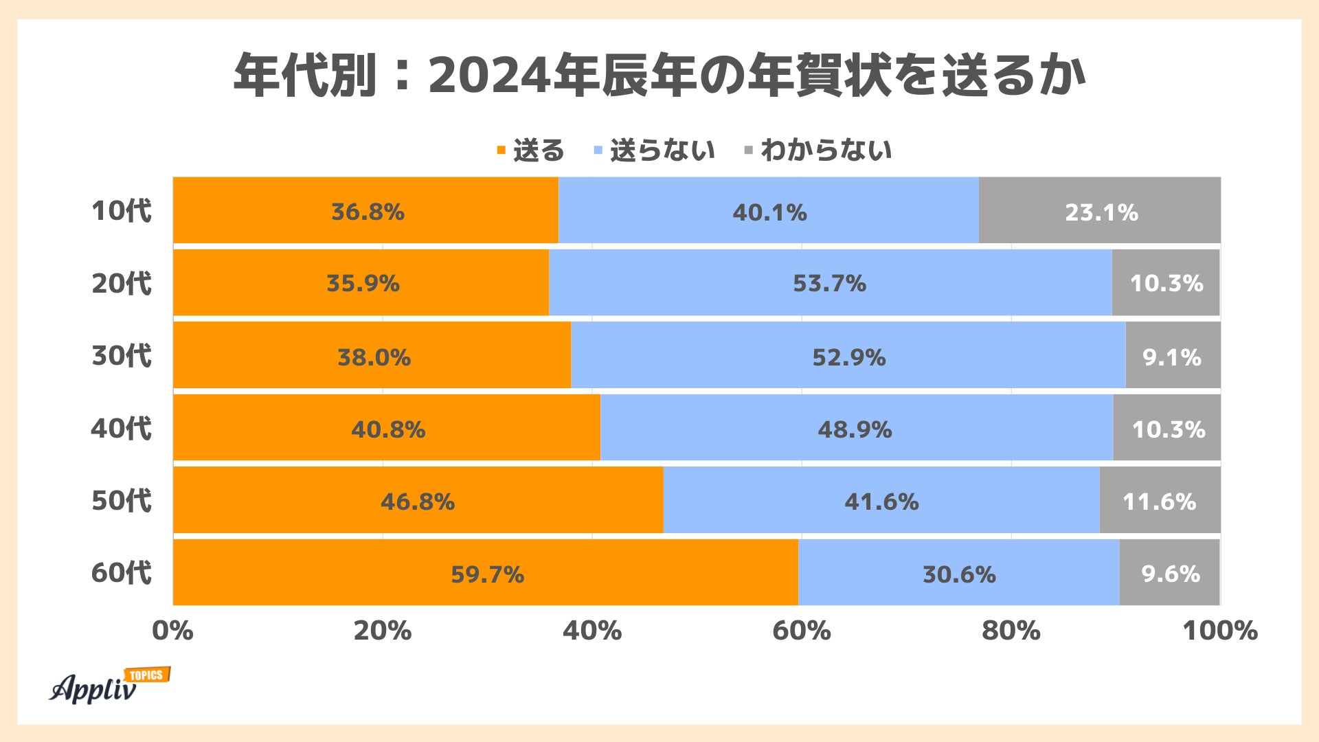 年代別に回答の内訳を見ると、「送る」が最も大きいのは60代で59.7%。全年代の中で唯一半数を超えました。