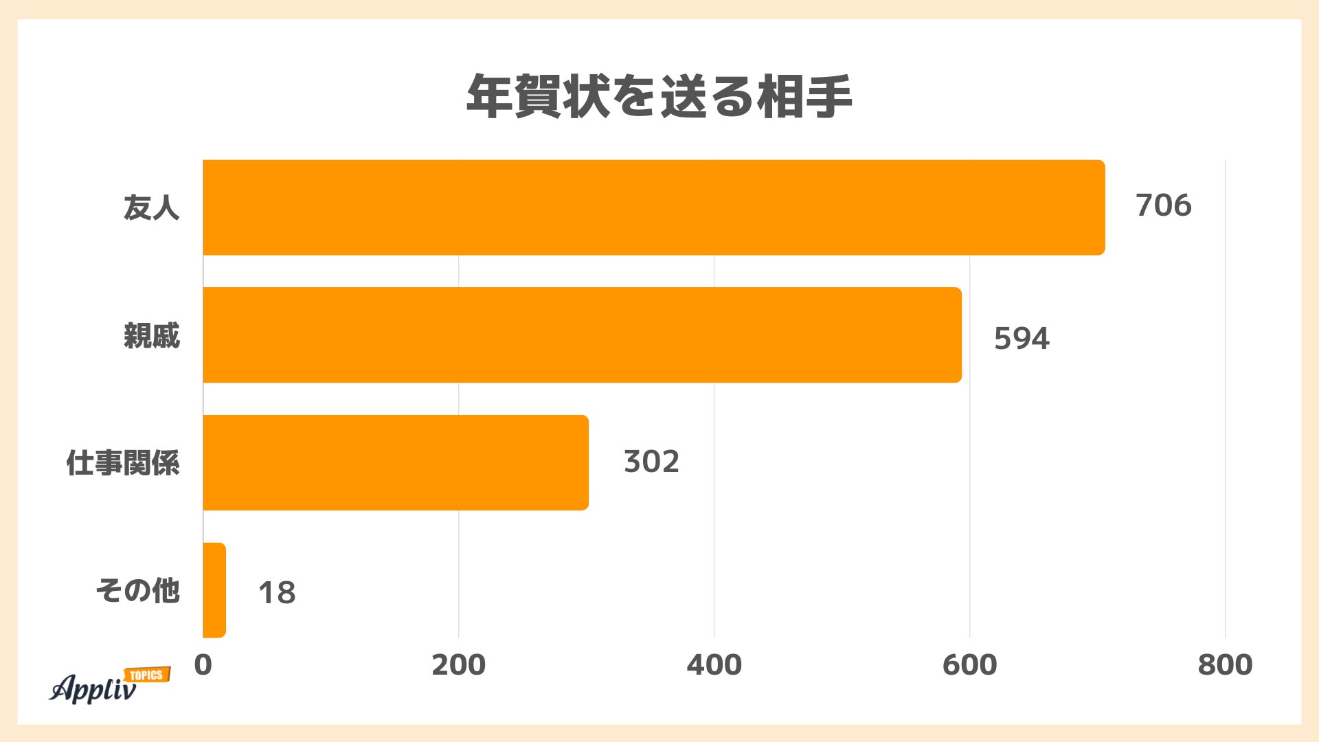 年賀状を「送る」と回答した865人に、年賀状を送る相手(複数回答可)を尋ねました。最多は「友人」で706人。回答者の約8割が友人に送っていることになります。「親戚」は594人、「仕事関係」は302人でした。