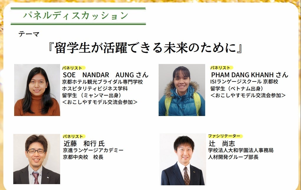 今回は今年度成果報告の後、京都府内の専修学校教職員やその留学生、日本語学校教員やその留学生を招き、「留学生が活躍できる未来のために」をテーマにパネルディスカッション形式で参加者に発信します。