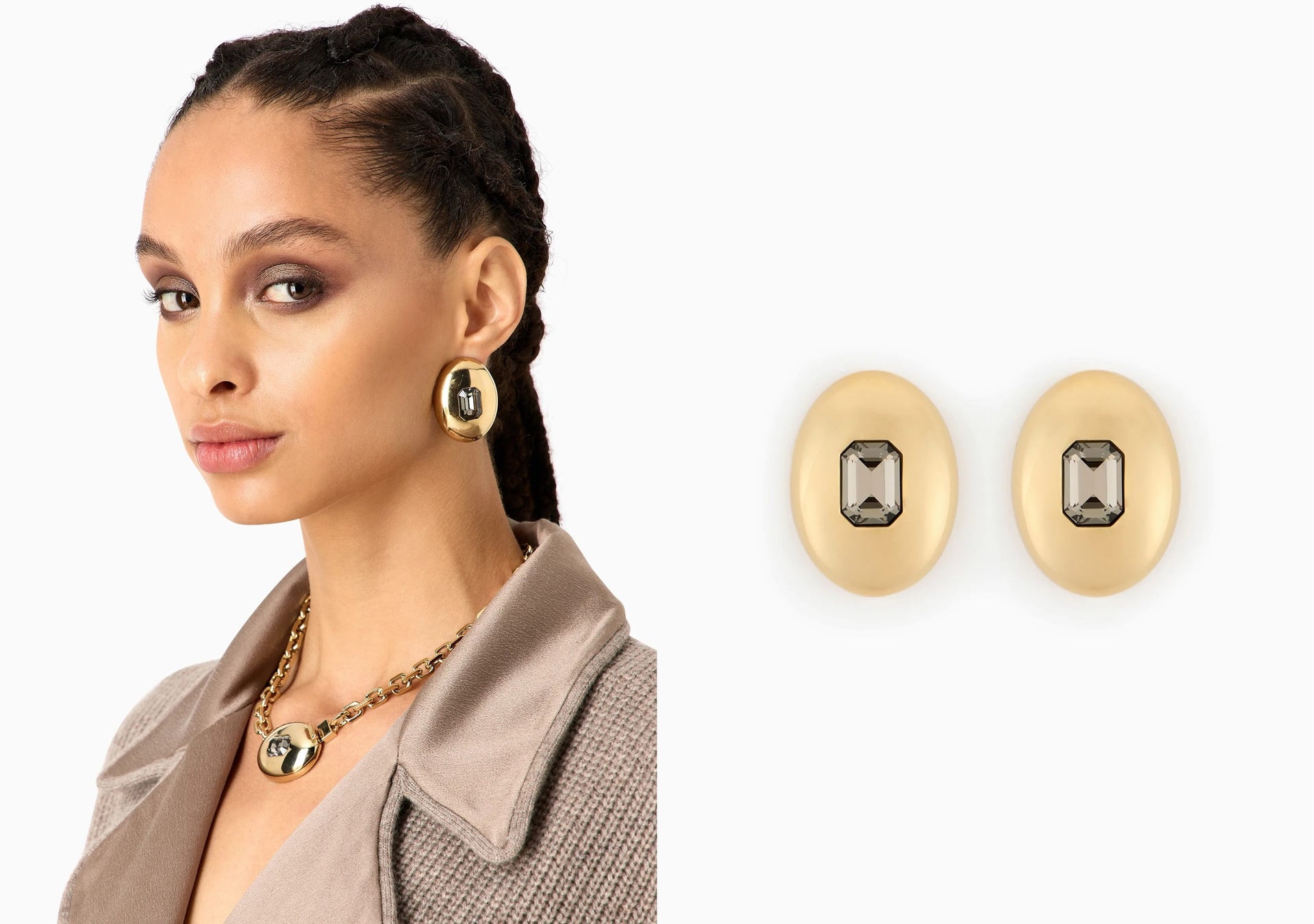 中央のクリスタルの控えめな煌めきが印象的な、ゴールドメタル製の楕円形のイヤリング。 どんな装いにもマッチし、フェイス周りを華やかに彩ります。洗練されたセンスが光るギフトです。
